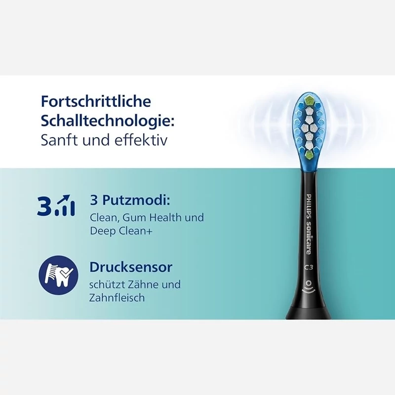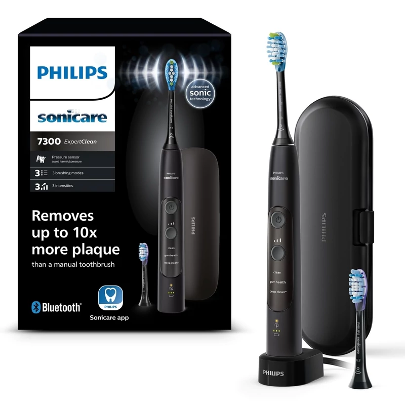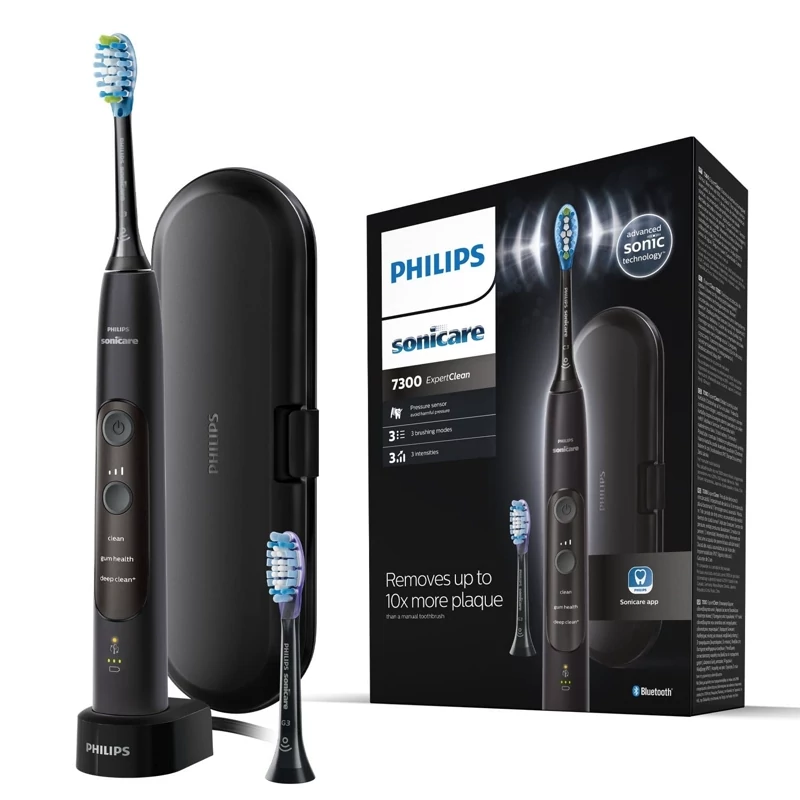 🦷 شامل 1 دسته مشکی ExpertClean 7300، 1 سر محافظ پلاک برتر C3، 1 سر مراقبت از آدامس G3 Premium، 1 کیف مسافرتی و 1 پایه شارژ