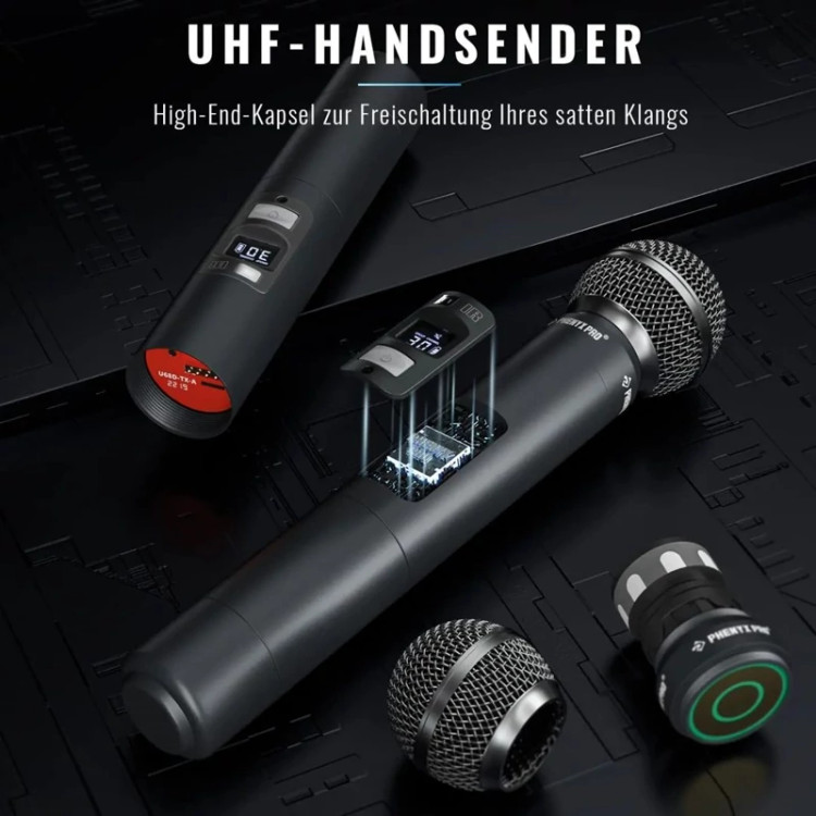 سیستم میکروفون بیسیم Phenyx Pro دو عدد میکروفون بیسیم پویا دستی، کانالهای UHF قابل تنظیم 2x100، اسکن خودکار، برد 328 فوت، میکروفون برای آواز خواندنی ، کارائوکه مدل (PTU-71-2H) ویژگی ها