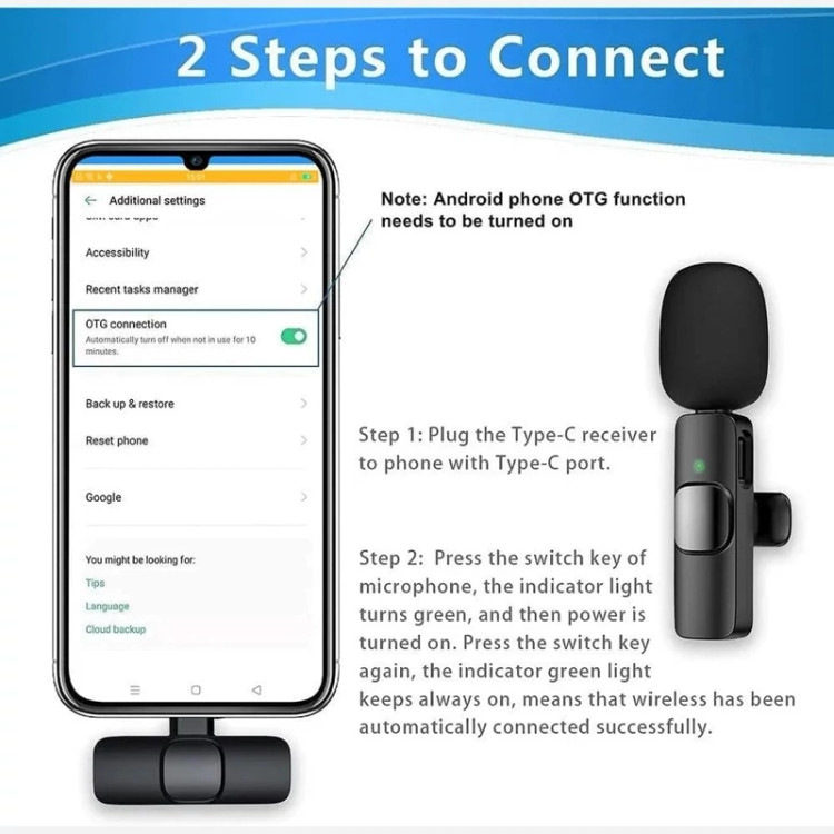 【اتصال و پخش】 فعال کردن OTG در تلفنها، این میکروفون گیرهای استفاده آسانی دارد، جفت شدن خودکار، اتصال خودکار هنگام اتصال به گیرنده، بدون آداپتور، برنامه اضافی، بلوتوث مورد نیاز. چراغ قرمز هنگام دریافت چشمک میزند؛ کلید سوئیچ میکروفون را فشار دهید، چراغ نشانگر سبز میشود، سپس روشن میشود؛ چراغ نشانگر قرمز گیرنده و چراغ نشانگر سبز میکروفون همیشه روشن میماند، سپس میتوانید با باز کردن دوربین تلفن، برنامه زنده یا سایر برنامهها از میکروفون برای دریافت صدا استفاده کنید.