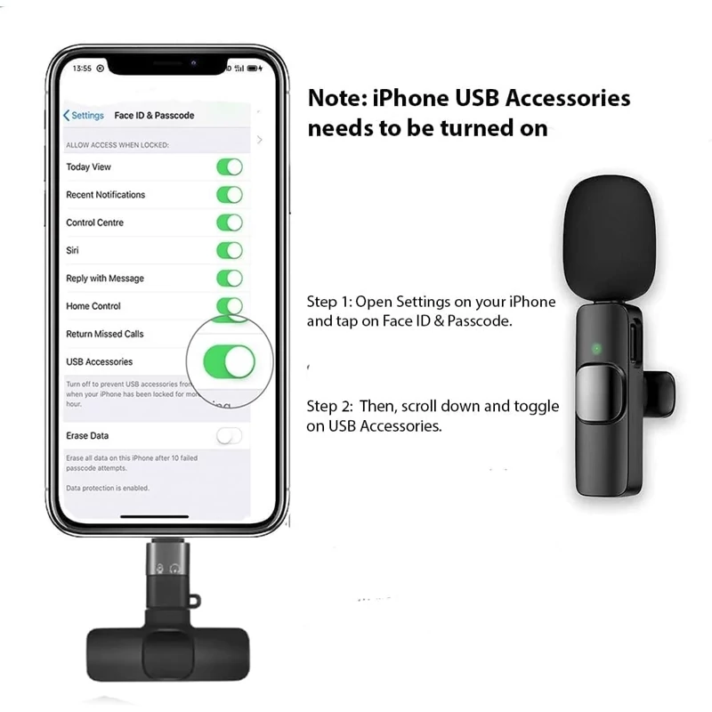 【اتصال و پخش】 فعال کردن OTG در تلفنها، این میکروفون گیرهای استفاده آسانی دارد، جفت شدن خودکار، اتصال خودکار هنگام اتصال به گیرنده، بدون آداپتور، برنامه اضافی، بلوتوث مورد نیاز. چراغ قرمز هنگام دریافت چشمک میزند؛ کلید سوئیچ میکروفون را فشار دهید، چراغ نشانگر سبز میشود، سپس روشن میشود؛ چراغ نشانگر قرمز گیرنده و چراغ نشانگر سبز میکروفون همیشه روشن میماند، سپس میتوانید با باز کردن دوربین تلفن، برنامه زنده یا سایر برنامهها از میکروفون برای دریافت صدا استفاده کنید.