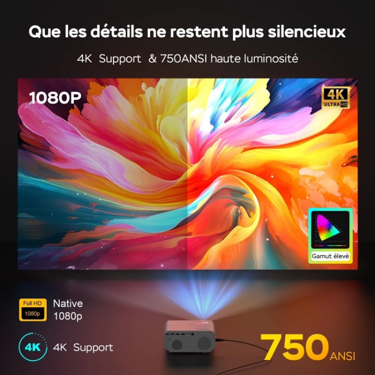 🏝 فناوری بهبود Native 1080P & 750ANSI & AI برای کیفیت تصویر: پروژکتور J61، با وضوح اصلی 1080P و پشتیبانی از 4K، از فناوری منبع نور LCD با انتقال نور تا 95٪ استفاده می کند، 750 لومن ANSI بدون افت به صفحه نمایش می رسد، مجهز به موتور. بهبود کیفیت تصویر هوش مصنوعی با کنتراست تا 18000:1، 98 درصد فضای رنگی را پوشش می دهد، برای بازتولید دقیق جزئیات و بافت ها، تصویر را زنده تر می کند، می توان تصویر بزرگ 300 اینچی را پخش کرد که مطابق با بزرگنمایی هر صحنه جذاب به اندازه تلویزیون 29 55 اینچی است.