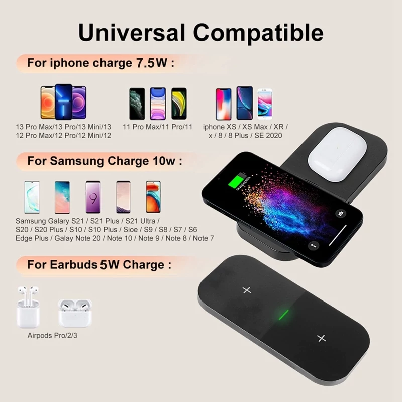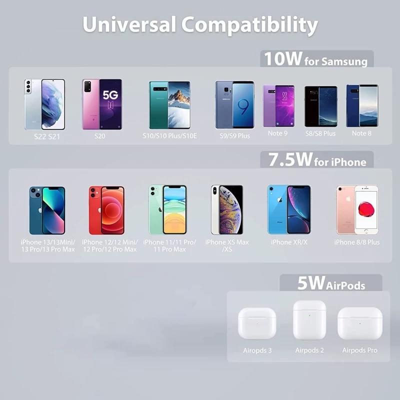 ✅️【سازگار با گوشی های هوشمند Qi/گوشی TWS】 ●سازگار با iPhone 14 Pro Max/14 Pro/14 Plus/14/13Pro Max/13por/13mini/12Pro Max/12 pro/12/12mini /iPhone11 series /iPhoneX series/Galaxy S22/S52S/Galaxy S22+S51 FE/S20 Ultra/S20+/S20/S10/S10 Plus. ●سازگار با Airpods Pro/3/2، Galaxy Bus/Bus+/ Buds Live/ Pixel Buds/TWS. (توجه: این پد شارژ فاقد قسمت شارژ ساعت است و نمیتواند برای ساعت هوشمند شارژ شود)
