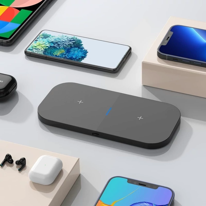 ✅️ 【شارژ بی سیم 2 در 1】این پد شارژ دارای دو موقعیت شارژ است و می تواند دو دستگاه را همزمان شارژ کند. هر دو موقعیت شارژ چپ و راست می توانند گوشی هوشمند یا ایرفون TWS را شارژ کنند. (توجه: این پد شارژ فاقد قسمت شارژ ساعت است و نمی تواند برای ساعت هوشمند شارژ شود.)