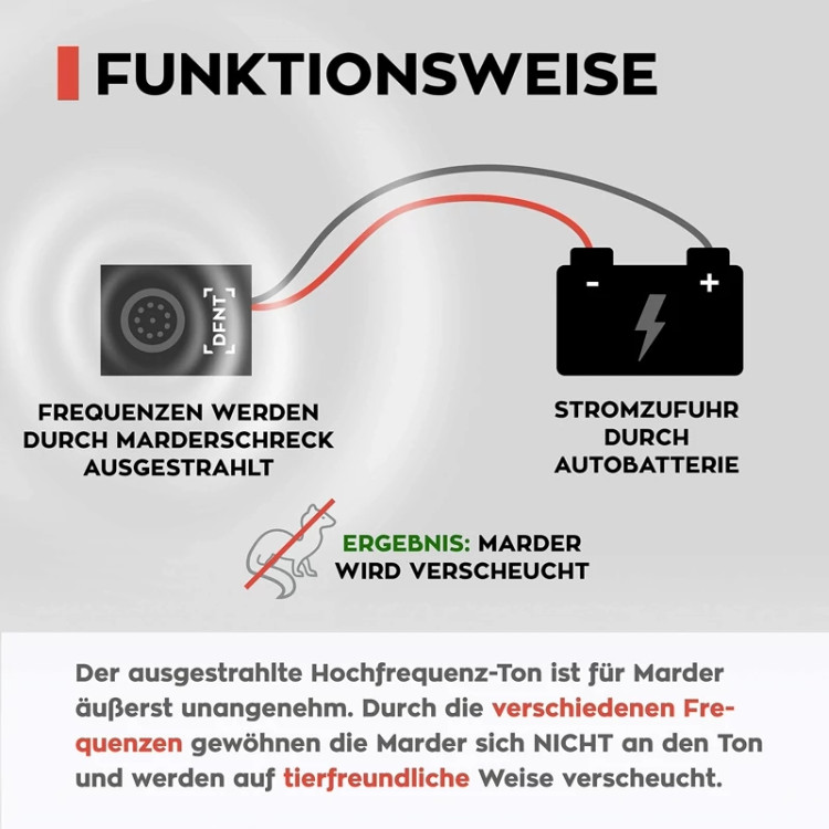✅️ کنترل موثر ماتن: بازدارنده مارتن DFNT به طور موثر و پایدار با صداهای مختلف مافوق صوت ماتن ها را دفع می کند و از آسیب های گران قیمت موتور به ماشین و خانه محافظت می کند. ✅️ بدون اثر آشنایی: به لطف صداهای اولتراسونیک پرترافیک در بازه های زمانی تغییر (20 ثانیه، 40، 60، 120 ثانیه)! برای انسان به سختی قابل توجه است، اما برای جانوران بسیار ناخوشایند است. ✅️ حداقل مصرف برق: بازدارنده مارتن DFNT مستقیماً به باتری خودرو متصل میشود و حداقل مصرف انرژی تنها با 0.6 وات دارد - ایدهآل حتی در طول عمر طولانیتر. ✅️ مناسب برای همه برندهای خودرو: حفاظت از ماتن DFNT در حلقه های بی پایان در تمام محفظه های موتور به صدا در می آید تا از هزینه های بالای مونتاژ برای تعمیرات دقیق ناشی از نیش ماتن جلوگیری کند. ✅️ ️نکته تخصصی: برای دفاع نهایی، توصیه می کنیم برای از بین بردن عطرهای باقیمانده ماتن، ماشین را از قبل بشویید
