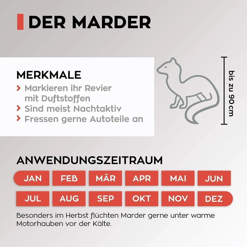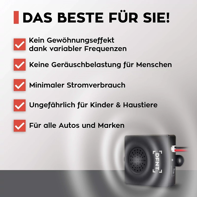 ✅️ کنترل موثر ماتن: بازدارنده مارتن DFNT به طور موثر و پایدار با صداهای مختلف مافوق صوت ماتن ها را دفع می کند و از آسیب های گران قیمت موتور به ماشین و خانه محافظت می کند. ✅️ بدون اثر آشنایی: به لطف صداهای اولتراسونیک پرترافیک در بازه های زمانی تغییر (20 ثانیه، 40، 60، 120 ثانیه)! برای انسان به سختی قابل توجه است، اما برای جانوران بسیار ناخوشایند است. ✅️ حداقل مصرف برق: بازدارنده مارتن DFNT مستقیماً به باتری خودرو متصل میشود و حداقل مصرف انرژی تنها با 0.6 وات دارد - ایدهآل حتی در طول عمر طولانیتر. ✅️ مناسب برای همه برندهای خودرو: حفاظت از ماتن DFNT در حلقه های بی پایان در تمام محفظه های موتور به صدا در می آید تا از هزینه های بالای مونتاژ برای تعمیرات دقیق ناشی از نیش ماتن جلوگیری کند. ✅️ ️نکته تخصصی: برای دفاع نهایی، توصیه می کنیم برای از بین بردن عطرهای باقیمانده ماتن، ماشین را از قبل بشویید