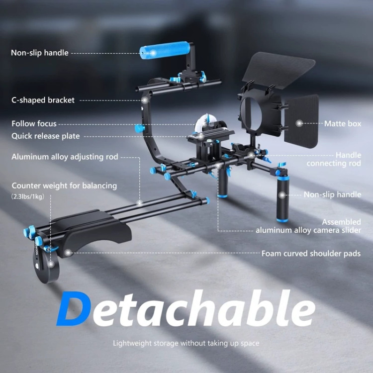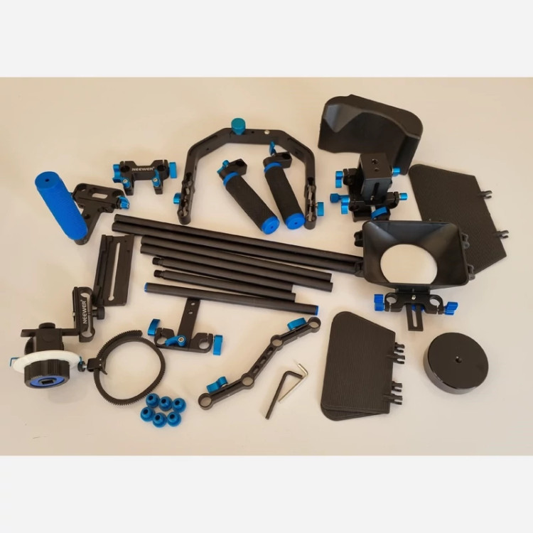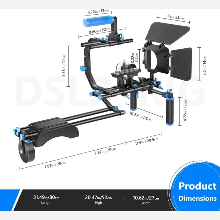 ✅️ کیت شامل: (1) براکت C شکل + (1) دستگیره بالای دسته + (2) میله 15 میلی متر + (1) جعبه مات + (1) فوکوس دنبال + (1) دکل شانه + (1) 2.5 پوند / 1.1 کیلوگرم وزن شمارنده