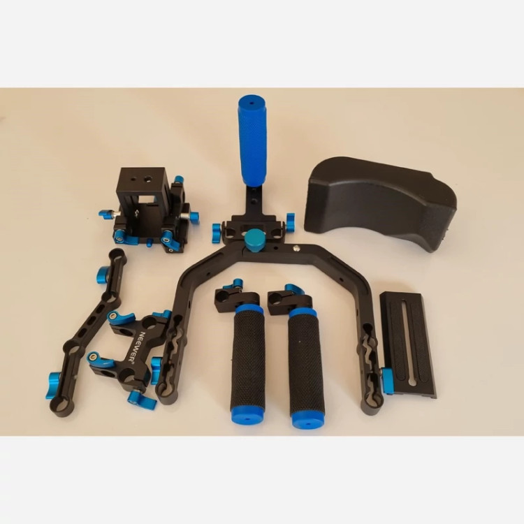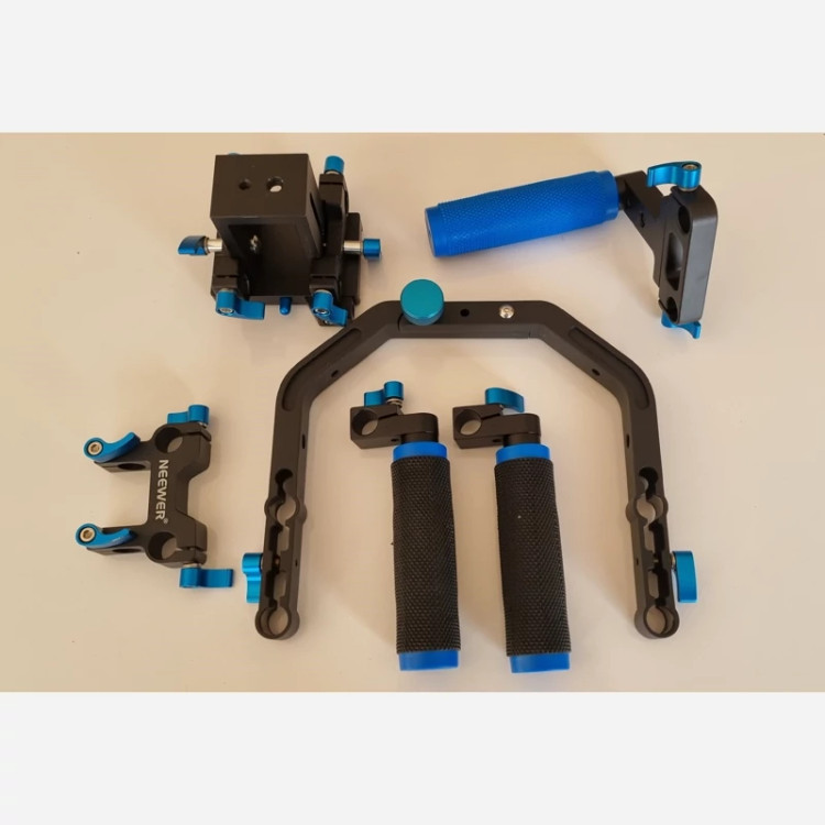 ✅️ Shoulder Rig شامل میله 15 میلی متری، پد لاستیکی نرم و دسته دوگانه برای همه دوربین های ویدئویی DSLR و دوربین های فیلمبرداری DV است.