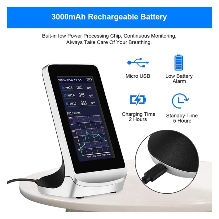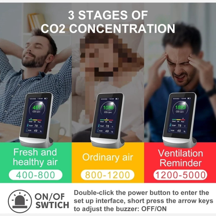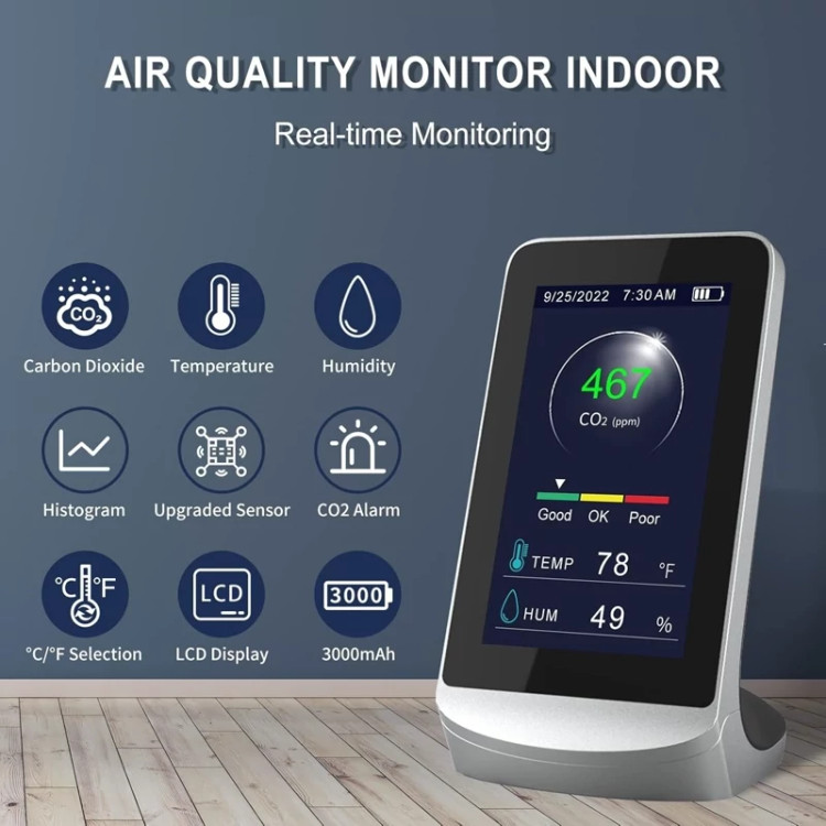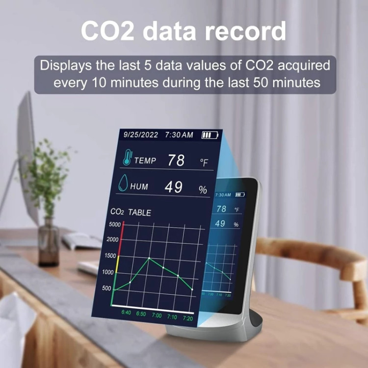 این محصول یک آشکارساز کیفیت هوا چند منظوره با عملکرد ساعت و ضبط است که می تواند CO2 (دی اکسید کربن)، دما و رطوبت را تشخیص دهد.