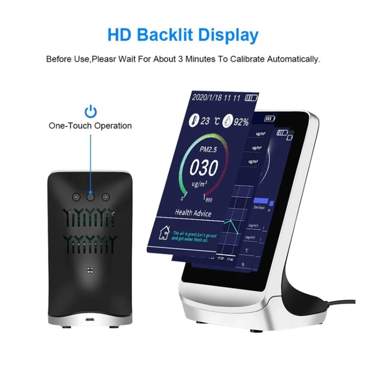 به عنوان یک تجهیزات علمی تست کیفیت هوا، سنسورهای مادون قرمز (NDIR) و فن های داخلی را ترکیب می کند با یک صفحه نمایش با وضوح بالا، می تواند CO2 (دی اکسید کربن)، دما و رطوبت را در زمان واقعی بر روی صفحه نمایش LCD دیجیتال خود نظارت کند.