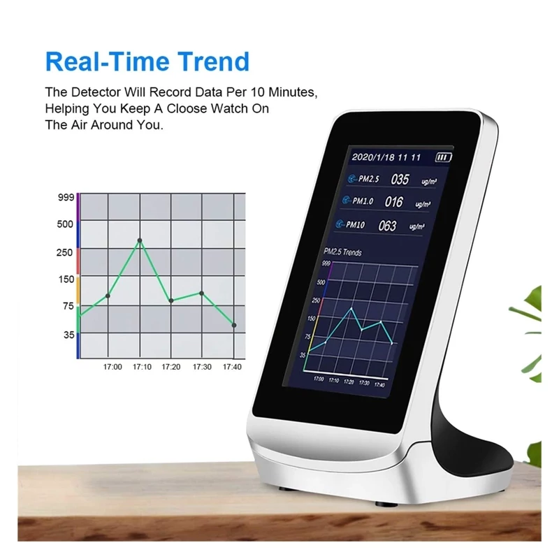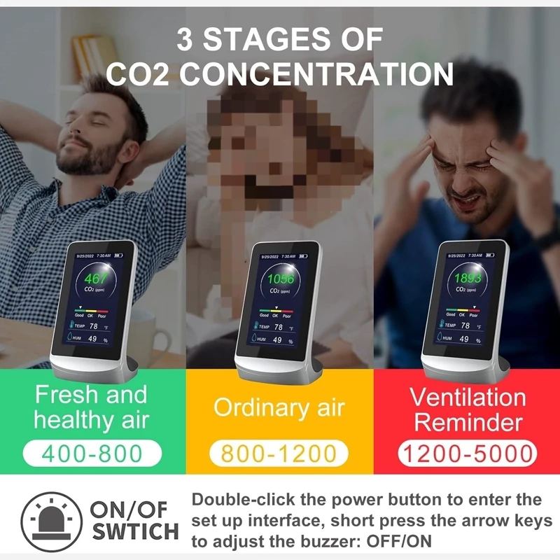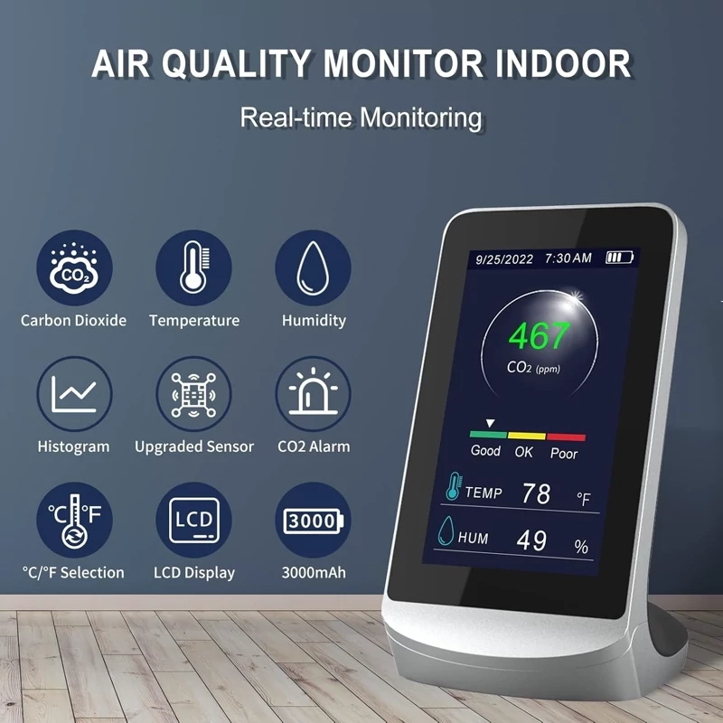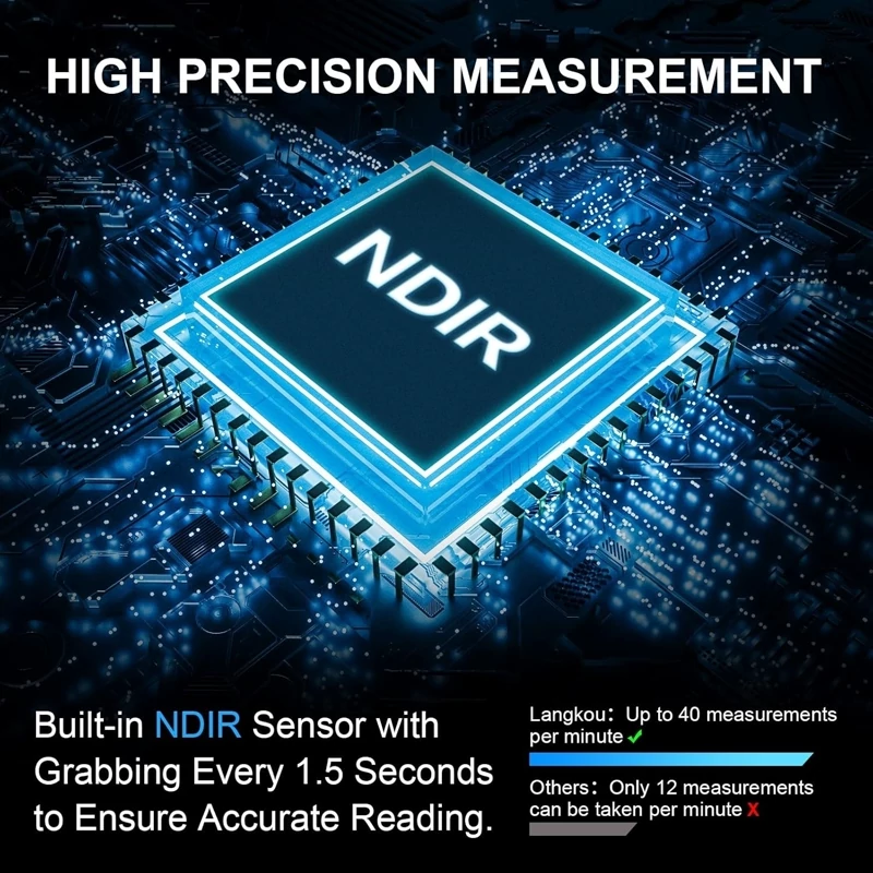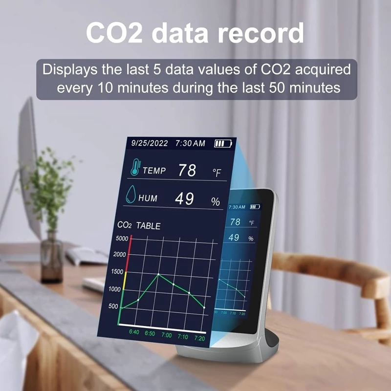 به عنوان یک تجهیزات علمی تست کیفیت هوا، سنسورهای مادون قرمز (NDIR) و فن های داخلی را ترکیب می کند با یک صفحه نمایش با وضوح بالا، می تواند CO2 (دی اکسید کربن)، دما و رطوبت را در زمان واقعی بر روی صفحه نمایش LCD دیجیتال خود نظارت کند.