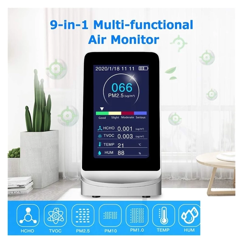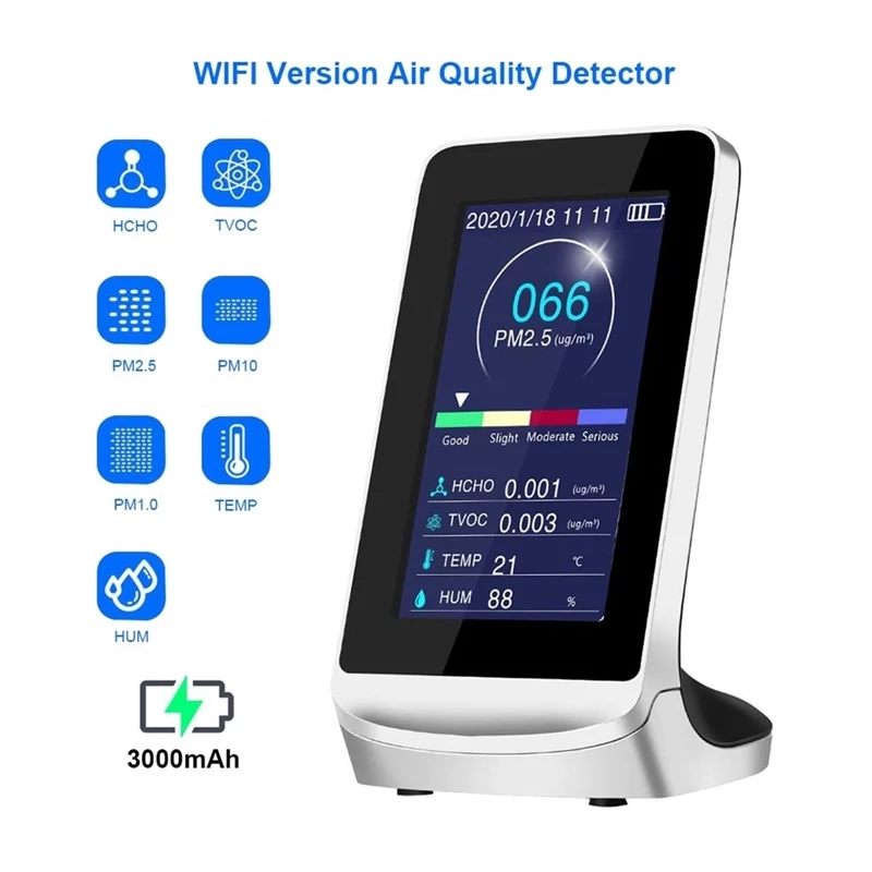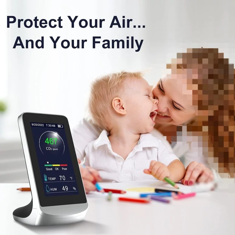 این محصول یک آشکارساز کیفیت هوا چند منظوره با عملکرد ساعت و ضبط است که می تواند CO2 (دی اکسید کربن)، دما و رطوبت را تشخیص دهد.