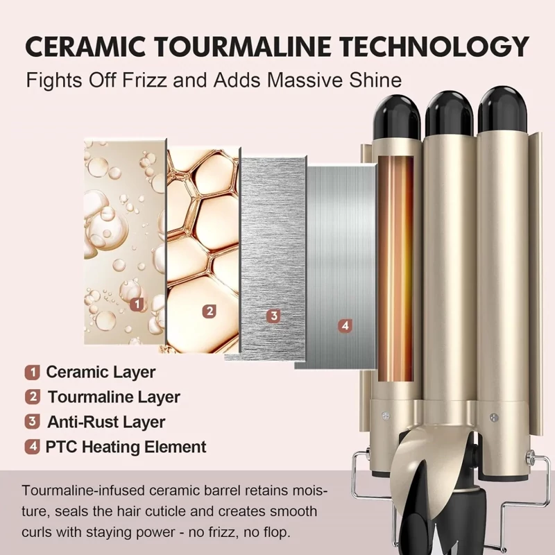 ✅️ سرامیک تورمالین - پوشش صفحات گرمایشی: روکش سرامیکی صفحات با کریستال های تورمالین غنی شده است که هنگام گرم شدن یون های منفی آزاد می کنند. این کار از شارژ ساکن مو جلوگیری می کند و ساختار سطحی فیبر مو را در حین استفاده می بندد. نتیجه یک درخشش خیره کننده زیبا بود.