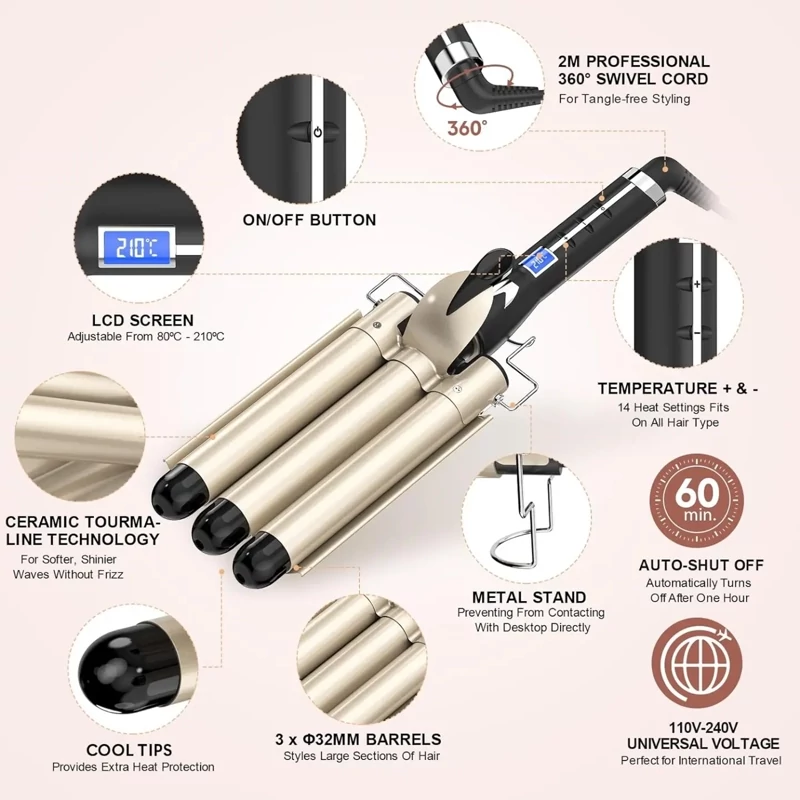 ✅️ آسان برای استفاده - همه می توانند ایجاد کنند! ویو استایلر عالی برای مبتدیان است، زیرا: به دلیل وجود عناصر گرمایش گردتر که امواجی با شکل زیبا ایجاد می کند، فرهای عالی را تنها در یک حرکت شکل می دهد. اگر میخواهید به موجها حالت دهید، نیازی به خم شدن غیر ضروری ندارید، بلکه به سادگی رشتههای خود را از بالا به پایین از طریق آهن موجدار بکشید - شما به راحتی و به سرعت امواجی بادوام خواهید داشت.