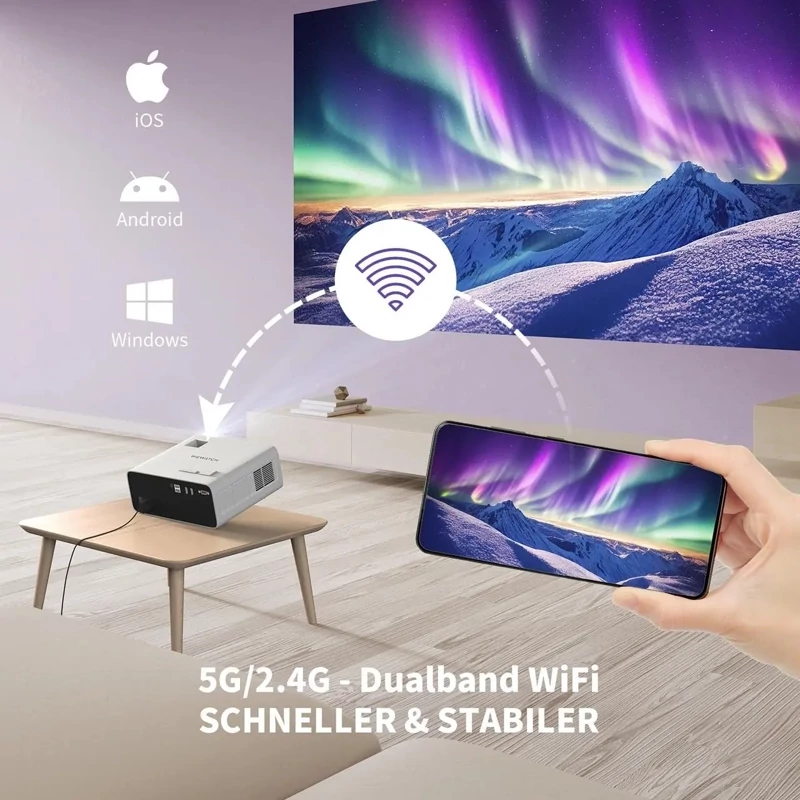 📺 【WiFi 5G Dual Band】 ویدئو پروژکتور V51 PRO 5G WiFi به لطف وای فای دو بانده خود تجربه ای روان و بدون تاخیر را ارائه می دهد. ایده آل برای سازماندهی مهمانی در فضای باز یا لذت بردن از یک شب فیلم با هدست بلوتوث.