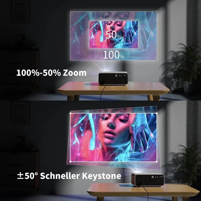 📺 【تصحیح سریع اعوجاج ذوزنقه ای و عملکرد زوم 50%】 صرف نظر از زاویه یا موقعیت، ویدئو پروژکتور V51 PRO 4K Full HD 1080P به شما امکان می دهد با فناوری تصحیح سریع و عملکرد زوم دیجیتال، اندازه صفحه نمایش عالی داشته باشید.