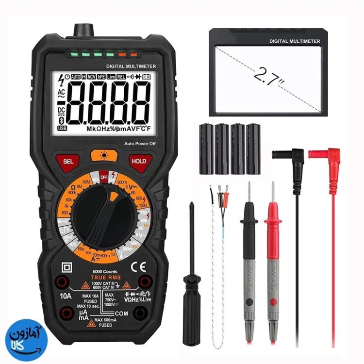 ✅️ محتوای تحویل - 1 عدد مولتیمتر دیجیتال، 1 عدد پیچگوشتی، 4 عدد باتری قلمی 1.5 ولتی، 1 عدد دفترچه راهنمای کاربر چندزبانه، 2 عدد پراب تست (قرمز/مشکی)، 1 عدد پراب تست آب.