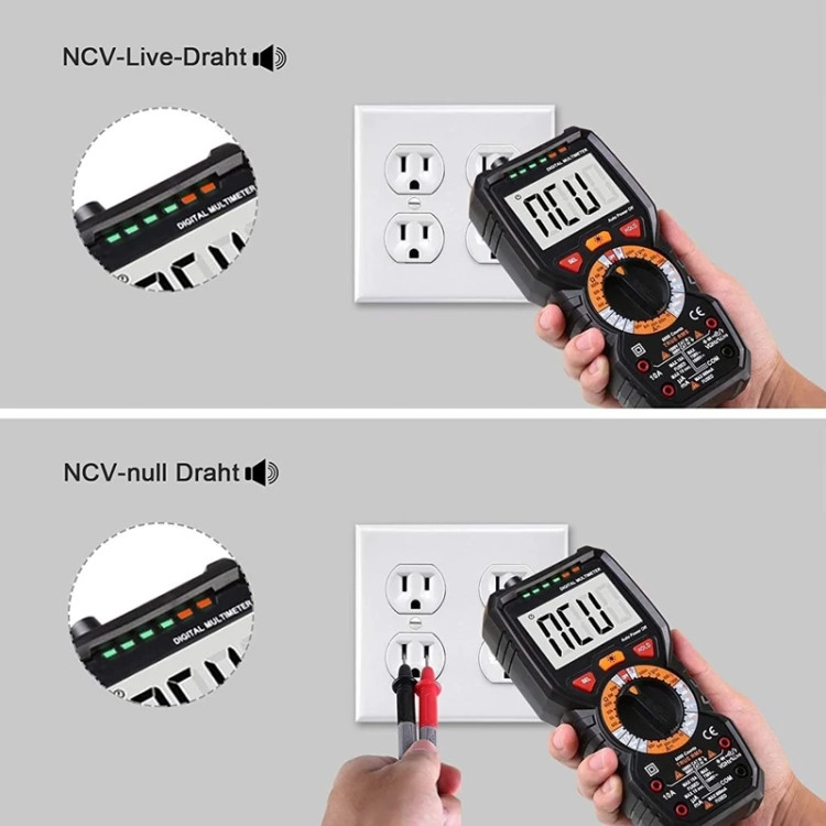✅️ تشخیص ولتاژ غیر تماسی و آزمایش خط برق - هنگامی که دستگاه شارژ میشود، LED روشن میشود، بوق میزند و صفحه نمایش NCV را نشان میدهد. هنگامی که اتصال فعال است (تشخیص فاز)، LED روشن میشود، بوق میزند و صفحه نمایش LIVE را نشان میدهد.