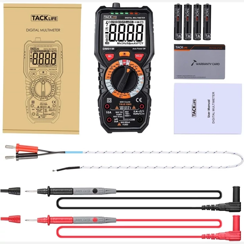 ✅️ محتوای تحویل - 1 عدد مولتیمتر دیجیتال، 1 عدد پیچگوشتی، 4 عدد باتری قلمی 1.5 ولتی، 1 عدد دفترچه راهنمای کاربر چندزبانه، 2 عدد پراب تست (قرمز/مشکی)، 1 عدد پراب تست آب.