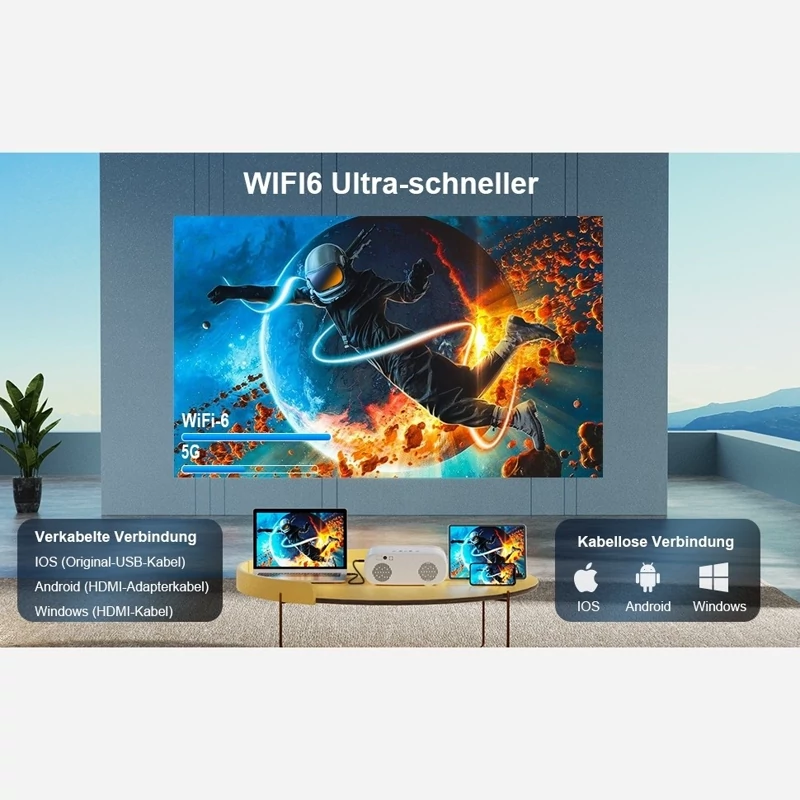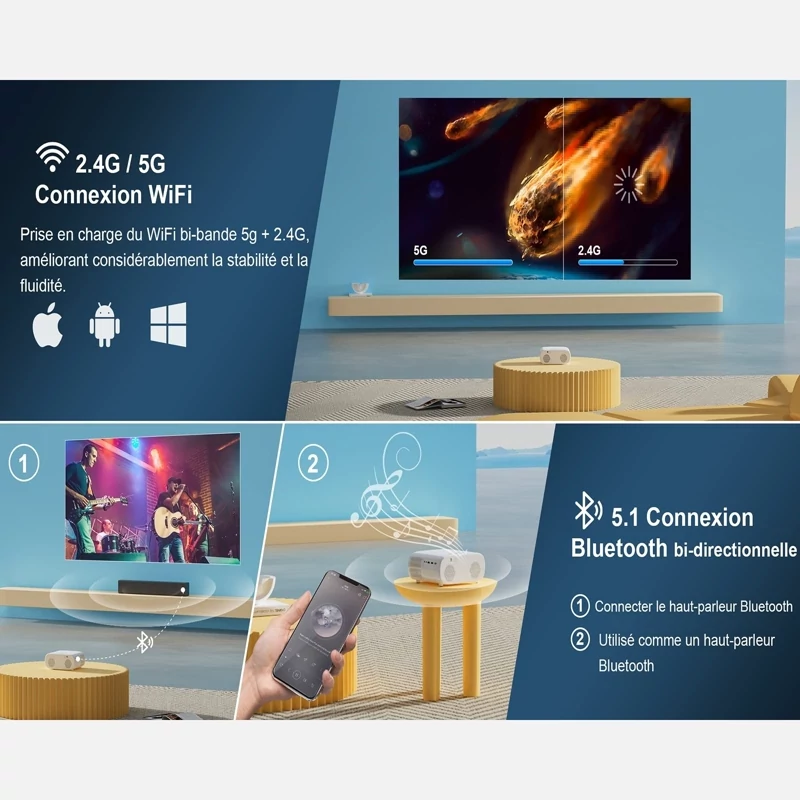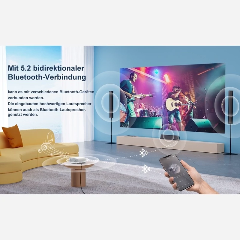 ✅️ پروژکتور Wi-Fi دارای 12 پس زمینه یکپارچه به انتخاب شماست. بلوتوث دو طرفه WiFi 6+ 5.2: با جدیدترین فناوری WiFi 6، پروژکتور E30 با هر دو شبکه 2.4G و 5G کار می کند و دارای قابلیت ضد تداخل قوی برای کاهش 60 درصد تاخیر نسبت به سایر پروژکتورهای بلوتوث است. فناوری بلوتوث 5.2 به شما امکان می دهد از پروژکتور به عنوان یک دستگاه صوتی بلوتوث مستقل استفاده کنید و بلندگوی استریو 12 واتی داخلی، بالا و پایین های واضح را برای یک تجربه تئاتر واقعی فراهم می کند.