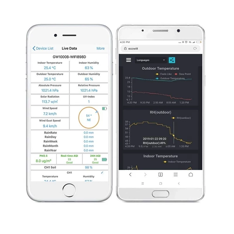 ☀️【دادههای زنده در برنامه کاربردی】: تمام دادههای حسگر را در دسترس برنامه تلفن همراه (WSView Plus یا Ecowitt APP برای iOS یا Android) در شبکه محلی شما قرار میدهد. برنامه تلفن همراه همچنین برای مشاهده محلی دادههای حسگر و کمک به پیکربندی خدمات استفاده میشود.