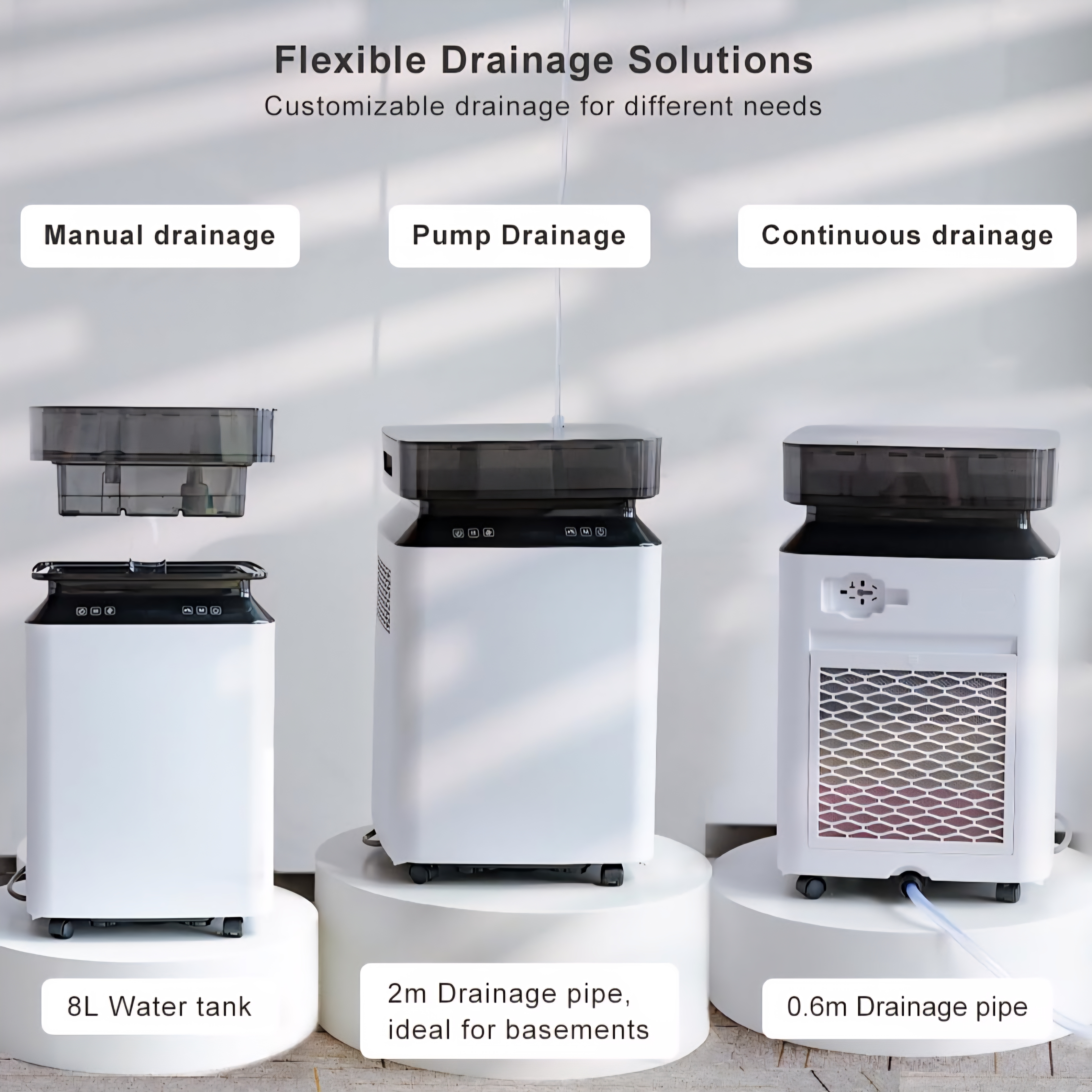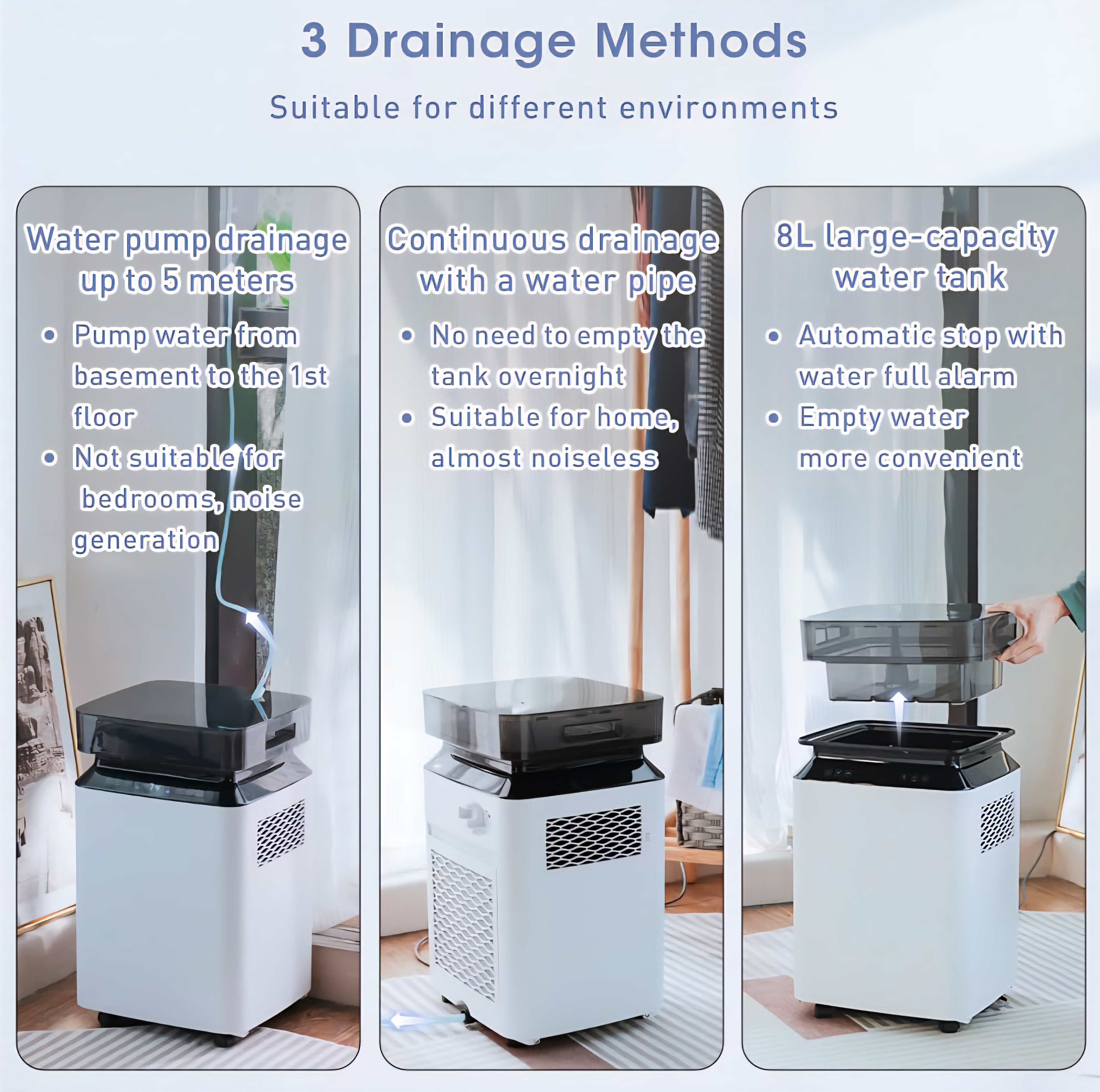 ✅️ گزینههای متعدد تخلیه: با داشتن یک مخزن آب در بالا که میتواند به طور موثر آب را تا ظرفیت ۸ لیتر ذخیره کند، این رطوبتگیر برقی به طور خودکار خاموش میشود تا از هرگونه سرریز پس از پر شدن مخزن جلوگیری شود. برای تخلیه راحت، میتوانید یک شلنگ را به خروجی مخزن آب وصل کنید که آب را از طریق پمپ آب تخلیه میکند، به خصوص برای پمپاژ آب از زیرزمین به طبقه اول یا مستقیماً به خروجی پشتی رطوبتگیر مناسب است.