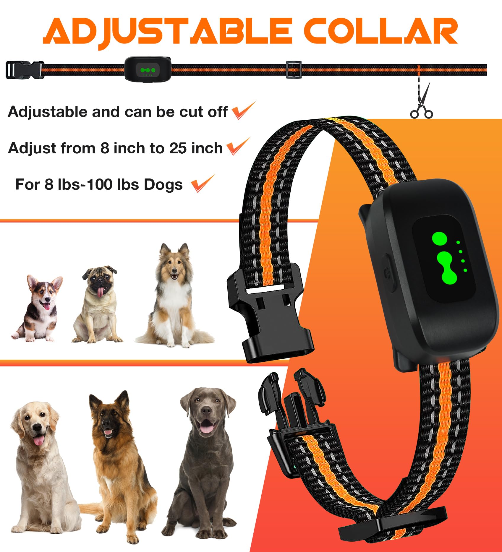 🦮 【قلاده قابل تنظیم】 قلاده ضدپارس را می توان به اندازه های مختلف سگ تنظیم کرد، طول را می توان از 8 اینچ تا 25 اینچ تنظیم کرد، مناسب برای سگ های 8-100 پوند. این بدان معنی است که شما به راحتی می توانید طول قلاده سگ را متناسب با اندازه گردن سگ خود تنظیم کنید و از راحت و ایمن بودن آن اطمینان حاصل کنید.