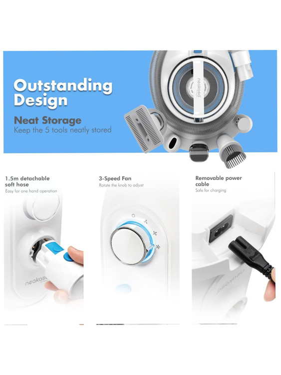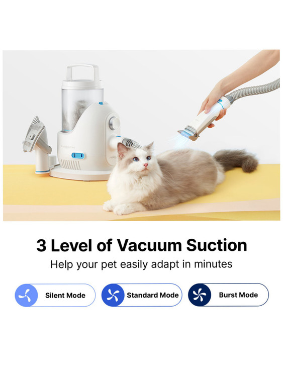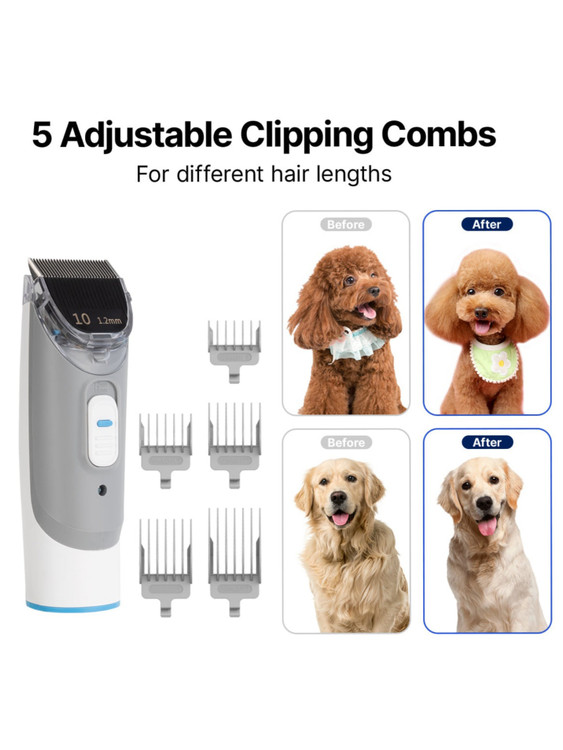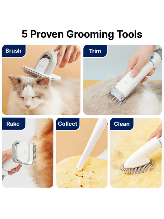 مجهز به 5 ابزار حرفهای: برس نظافت و برس ضد ریزش، خز حیوان خانگی شما را نرمتر و سالمتر میکند. ماشین اصلاح سگ با تیغه استیل ضد زنگ میتواند موهای اضافی حیوانات خانگی را به خصوص در تابستان کوتاه کند. برس تمیزکننده به شما این امکان را میدهد که پنجههای کوچک خود را بسایید یا موهای حیوانات خانگی چسبیده به خود را پاک کنید. در نهایت، نازل مکش تخت برای جمعآوری موهای حیوانات خانگی روی مبل، فرش یا پارکت است.