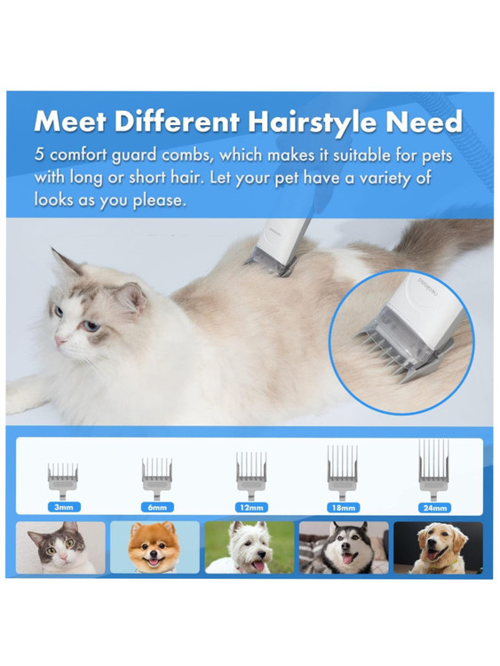 مجهز به 5 شانه حرفهای: شانههای 3 میلیمتری، 6 میلیمتری، 12 میلیمتری، 18 میلیمتری و 24 میلیمتری به شما این امکان را میدهند که طول موی حیوان خانگی خود را مطابق با نیازهای خاص نظافتی خود تنظیم کنید. به عنوان مثال، میتوانید از شانه 3 میلیمتری برای کوتاه کردن موهای اطراف پنجههای حیوان خانگی خود استفاده کنید، در حالی که از شانه 18 میلیمتری میتوان برای کوتاه کردن موهای پشت آنها استفاده کرد.