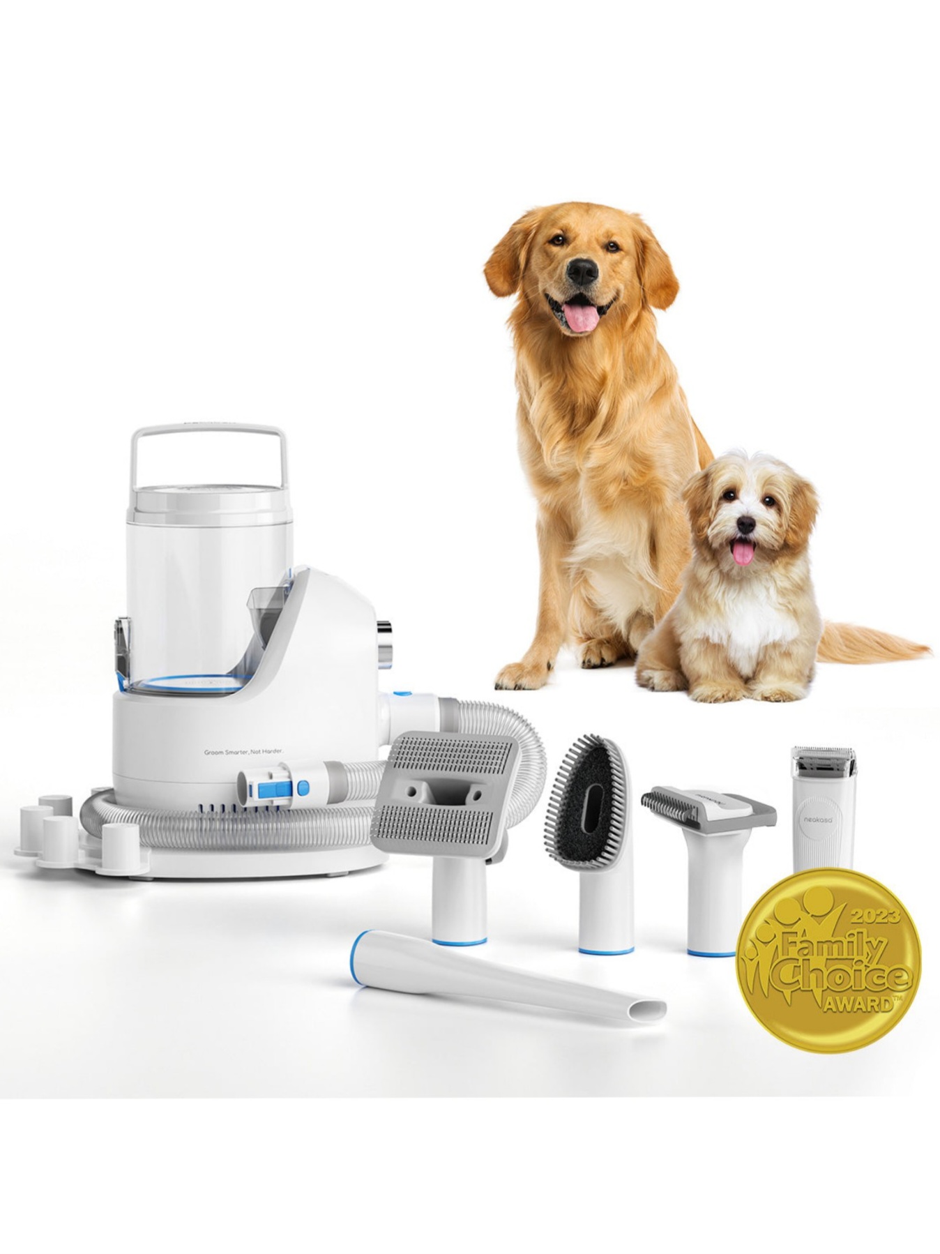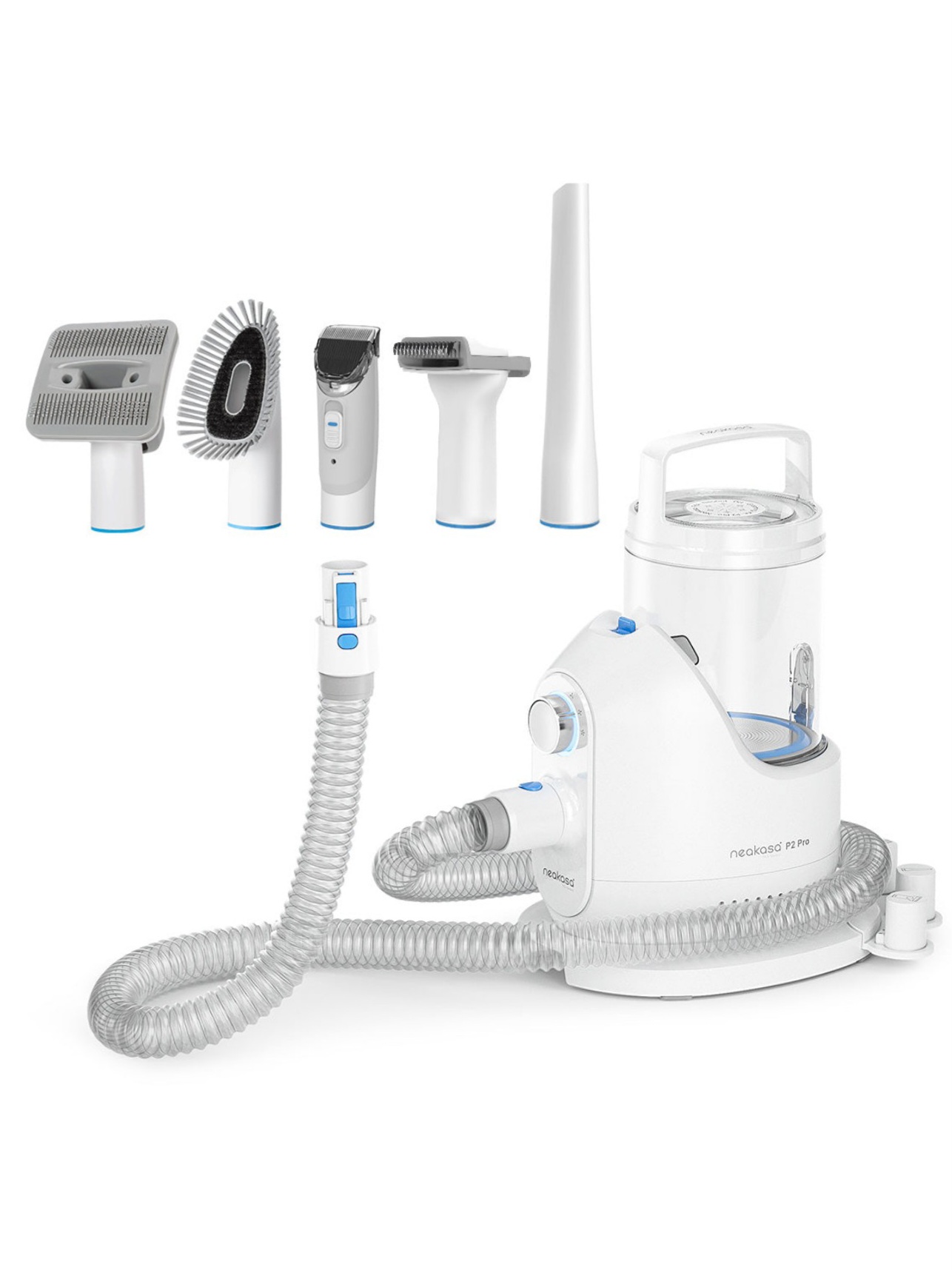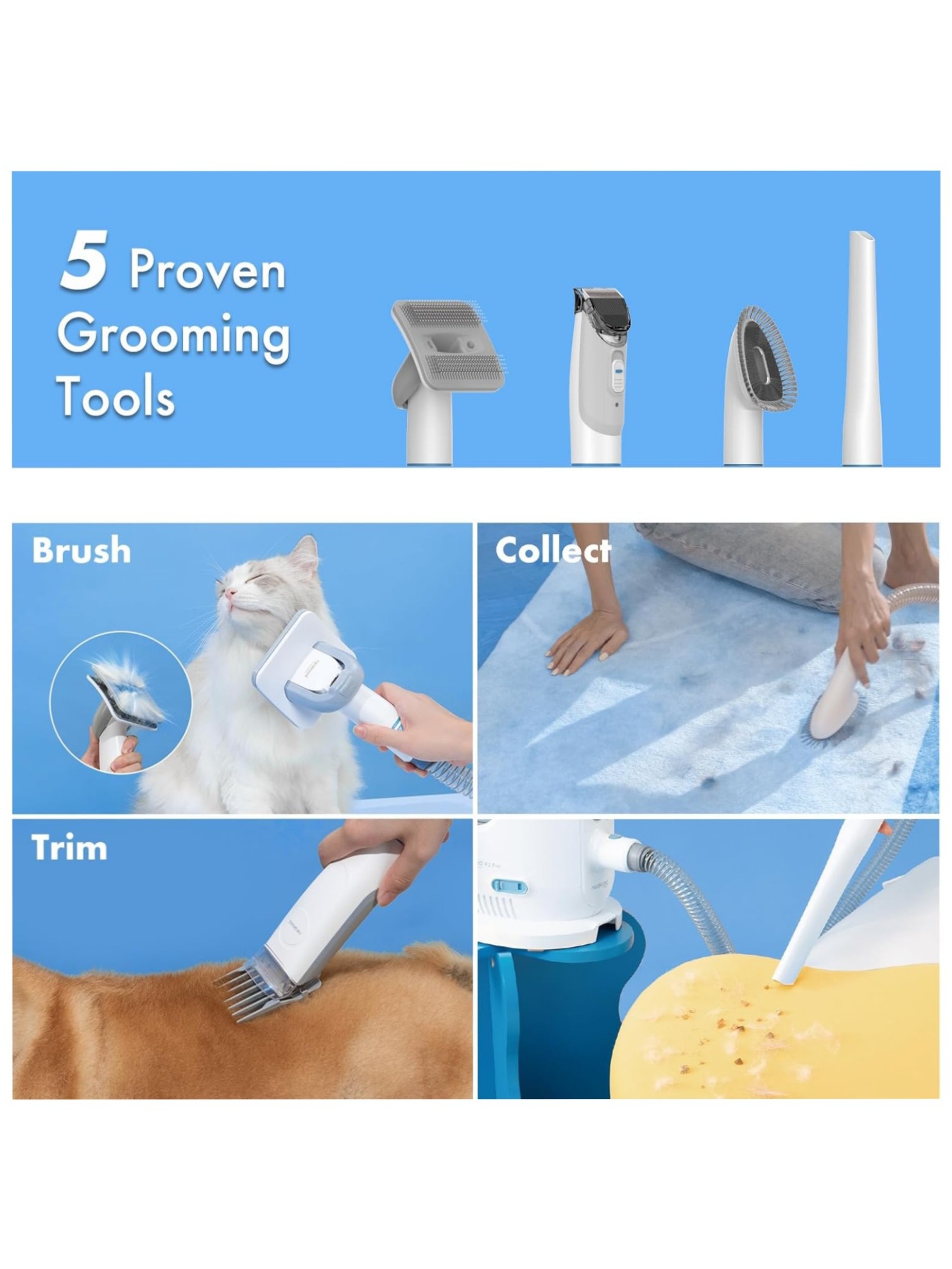 مجهز به 5 ابزار حرفهای: برس نظافت و برس ضد ریزش، خز حیوان خانگی شما را نرمتر و سالمتر میکند. ماشین اصلاح سگ با تیغه استیل ضد زنگ میتواند موهای اضافی حیوانات خانگی را به خصوص در تابستان کوتاه کند. برس تمیزکننده به شما این امکان را میدهد که پنجههای کوچک خود را بسایید یا موهای حیوانات خانگی چسبیده به خود را پاک کنید. در نهایت، نازل مکش تخت برای جمعآوری موهای حیوانات خانگی روی مبل، فرش یا پارکت است.
