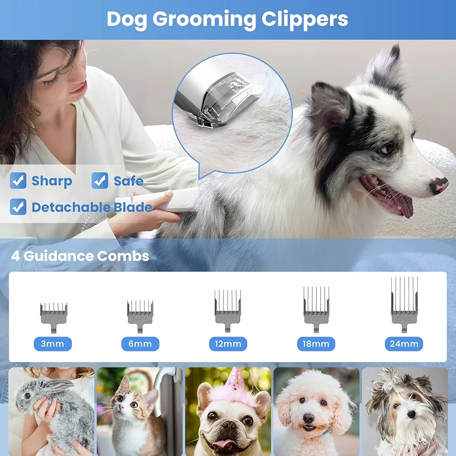 🐩【ماشین اصلاح برقی مو با 4 شانه】 برای سازگاری کامل با حیوانات خانگی مختلف، ما 4 شانه قابل تنظیم (6 میلیمتر/12 میلیمتر/18 میلیمتر/24 میلیمتر) را در اختیار شما قرار میدهیم که برای کوتاه کردن مو با طولهای مختلف مناسب هستند. چه حیوان خانگی شما یک گربه مو بلند بازیگوش باشد یا یک پودل مو فرفری زیبا، میتوانید مدل موهای او را متناسب با سلیقه خود تنظیم کنید، پس بیایید شروع کنیم.