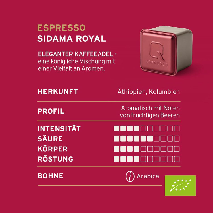 ☕️ بهترین QBO بهترین طعم QBO: ترکیبی سلطنتی برای یک اسپرسوی سبک برشته و بسیار معطر ساخته شده از ۱۰۰٪ دانههای عربیکا با طعم توت و اسیدیته ملایم. اسپرسویی عالی با رایحه گل و مرکبات لطیف (شدت ۴ از ۱۰) ساخته شده از ۱۰۰٪ قهوه عربیکا.