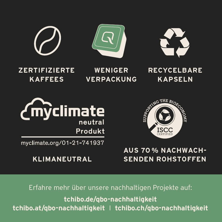 ☕️ قابل بازیافت و پایدار: کپسولهای Qbo مبتنی بر زیستبوم ما از ۷۰٪ مواد اولیه تجدیدپذیر نسل دوم ساخته شدهاند، قابل بازیافت و دارای گواهینامه ISCC از سال ۲۰۲۱ هستند.