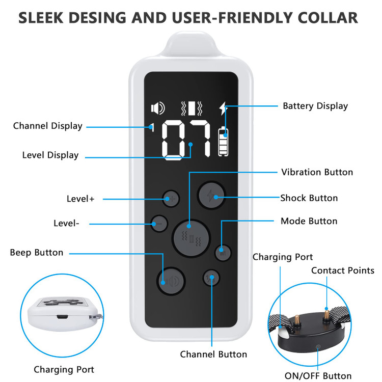 🐶 توجه: اگر این قلاده آموزشی کار نمی کند، لطفاً سطح مناسب لرزش، استاتیک و بیپ را بر اساس ویژگی های سگ خود مانند شخصیت، نوع، سن، وزن و غیره تنظیم کنید. هنگامی که گیرنده کار نمی کند، وارد حالت خواب می شود. بعد از 2 دقیقه هر دکمه ای را روی کنترل از راه دور فشار دهید تا دوباره فعال شود.