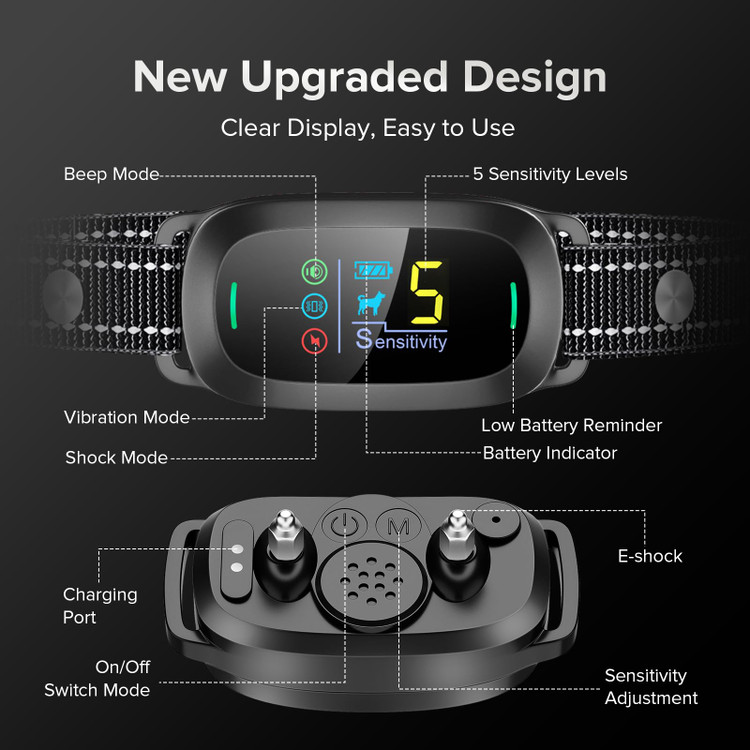 🐶 حالت محافظت: صفحه نمایش رنگی هوشمند به وضوح وضعیت کار و سطح قدرت را نشان می دهد. اگر قلاده پارس سگ 6 بار به طور مداوم فعال شده باشد. قلاده پوست به مدت 30 ثانیه از کار می افتد (نمایشگر دیجیتال به "8" تغییر می کند)، از سگ خود در برابر تنبیه غیر ضروری محافظت کنید.