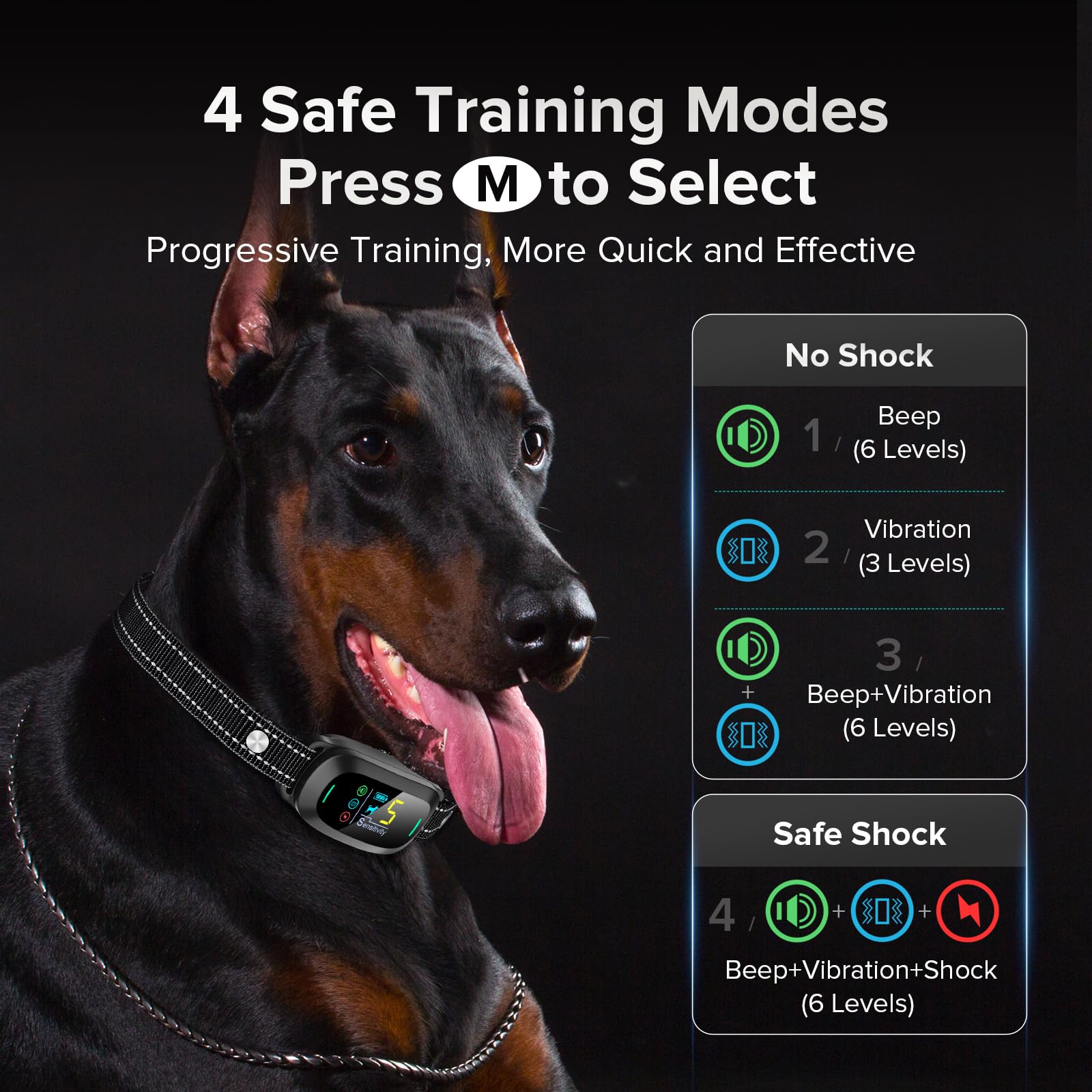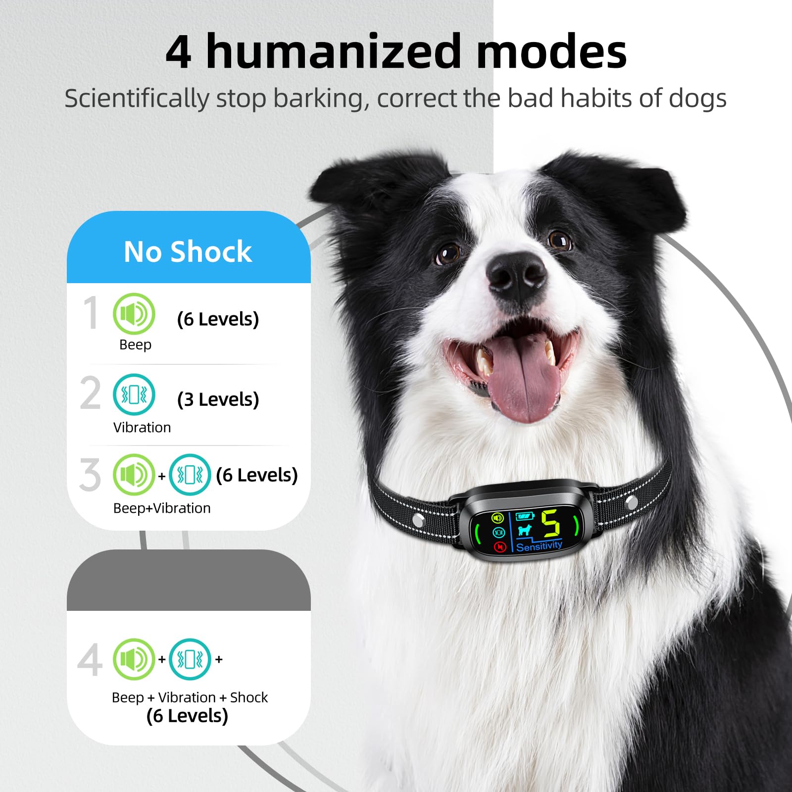 🐶 تنظیمات انسانی ایمن تر: قلاده پارس سگ دارای 4 حالت کار است، بدون حالت شوک: بوق، , بیپ +. حالت شوک: بوق + لرزش + شوک، 5 سطح حساسیت قابل تنظیم. فقط دکمه M را فشار دهید تا حالت را به دلخواه تغییر دهید، می توانید از زمان آرام لذت ببرید