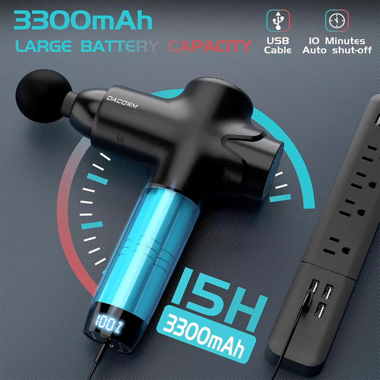 🍀 تفنگ ماساژ، مجهز به باتری لیتیومی ۳۳۰۰ میلیآمپر ساعتی، با یک بار شارژ ۸ تا ۱۵ ساعت دوام میآورد. همراه با کابل شارژ USB (دوشاخه شارژ شامل نمیشود)، مناسب برای همه پورتهای شارژ.