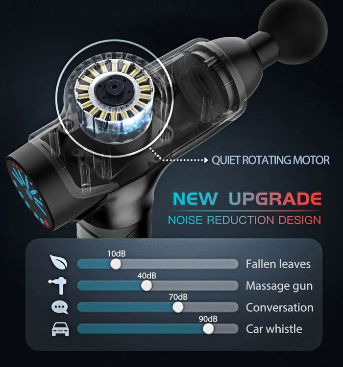 🍀 تفنگ ماساژ، صدای کمتر از ۴۰ دسیبل دارد و به شما امکان میدهد در دفتر، باشگاه و سفر، تجربه آرامش خوبی داشته باشید.