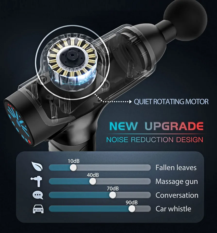 🍀 تفنگ ماساژ، صدای کمتر از ۴۰ دسیبل دارد و به شما امکان میدهد در دفتر، باشگاه و سفر، تجربه آرامش خوبی داشته باشید.