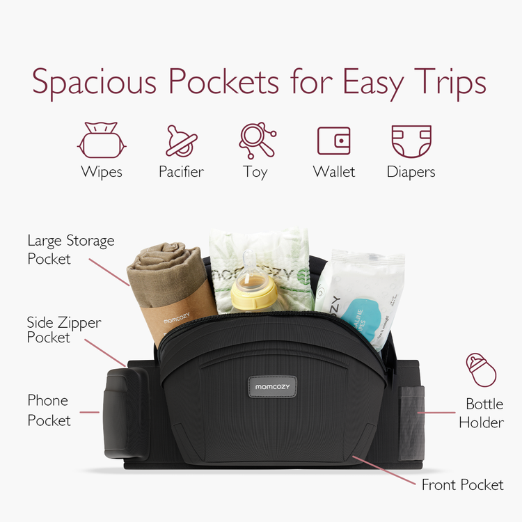👶 جیبهای ذخیرهسازی چندگانه: کریر صندلی کودک Momcozy همچنین به عنوان یک کیف پوشک عمل میکند و دارای جیبهای ذخیرهسازی متعدد است. پوشک و دستمال مرطوب را در فضای ذخیرهسازی پنهان زیر صندلی، وسایل ضروری مانند کلید و تلفن را در جیبهای کناری و شیشه شیر (تا ۱۵۰ میلیلیتر) را در نگهدارنده تعیین شده نگهداری کنید. همچنین میتوان آن را به صورت فشرده تا کرد تا وسایل ضروری کودک شما در طول سفر به راحتی حمل شود.