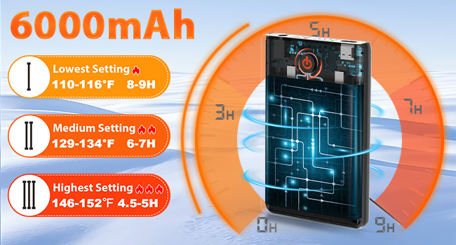 🔥【باتری 6000 میلیآمپر ساعت و 9 ساعت زمان کار】این جورابهای گرمکننده مجهز به یک باتری قابل شارژ لیتیوم-یونی با ظرفیت بالا 6000 میلیآمپر ساعت هستند که میتواند 5 تا 9 ساعت دوام بیاورد و در برابر شارژ، دشارژ و اتصال کوتاه محافظت میشود. طراحی نازک و منحنی آن تضمین میکند که باتری کاملاً در جورابها جا میگیرد و راحتی را هنگام پوشیدن افزایش میدهد. حتی اگر تلفن همراه شما در نزدیکی نباشد، میتوانید به راحتی جورابها را با استفاده از دکمههای بزرگ واقع در کنار باتری روشن/خاموش کنید یا دما را تنظیم کنید. نشانگرهای واضح قدرت و دما شما را از وضعیت باتری مطلع نگه میدارند. توجه: لطفاً قبل از استفاده، هر دو باتری را کاملاً شارژ کنید، که معمولاً ۳.۵ تا ۵ ساعت طول میکشد.