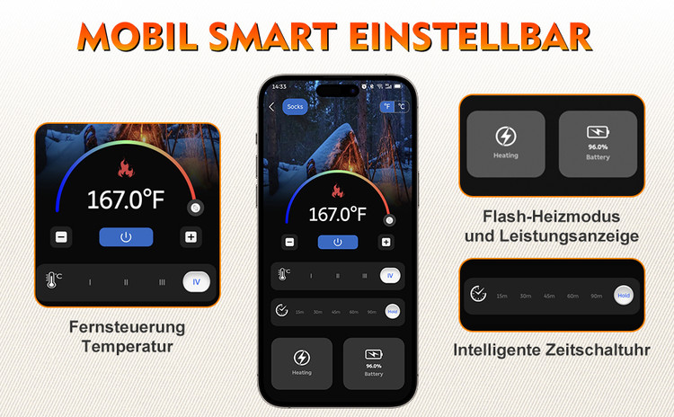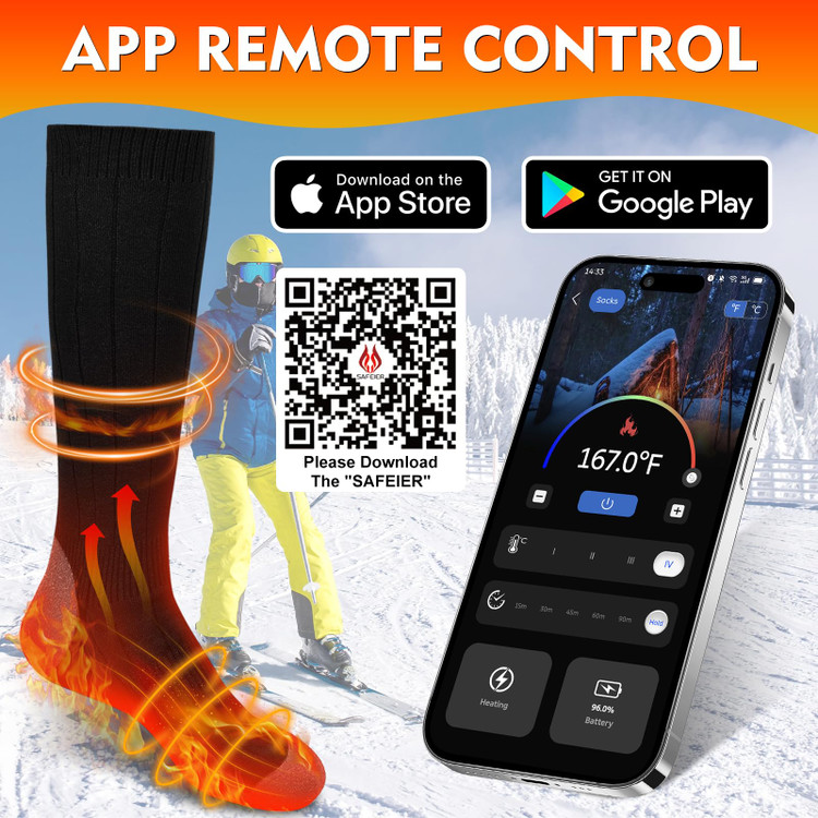 🔥 کنترل دوگانه برنامه و باتری: طراحی کنترل برنامه به شما امکان میدهد دما و زمان استفاده از جورابهای گرم را در هر زمان و هر مکان تنظیم کنید. وقتی تلفن همراهتان در دسترس نیست، میتوانید به سادگی آن را روشن/خاموش کرده و دما را با دکمه کنار باتری تنظیم کنید.
