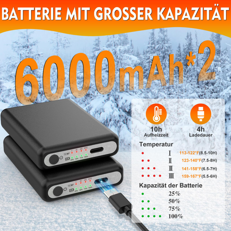 🔥 باتری قدرتمند: این جورابهای گرم شونده قابل شارژ که مجهز به دو باتری ۶۰۰۰ میلیآمپر ساعتی هستند، تا ۱۱ ساعت گرمای مداوم را فراهم میکنند. ولتاژ خروجی باتری ۵ ولت است که بسیار پایینتر از ولتاژ ایمن بدن انسان است. باتری و پد گرم کننده در عایق بادوام و با کیفیتی قرار گرفتهاند که با جلوگیری از شوک الکتریکی یا نشت، ایمنی شما را تضمین میکند. پورت شارژ Type-C گزینههای شارژ متعددی را در اختیار شما قرار میدهد.