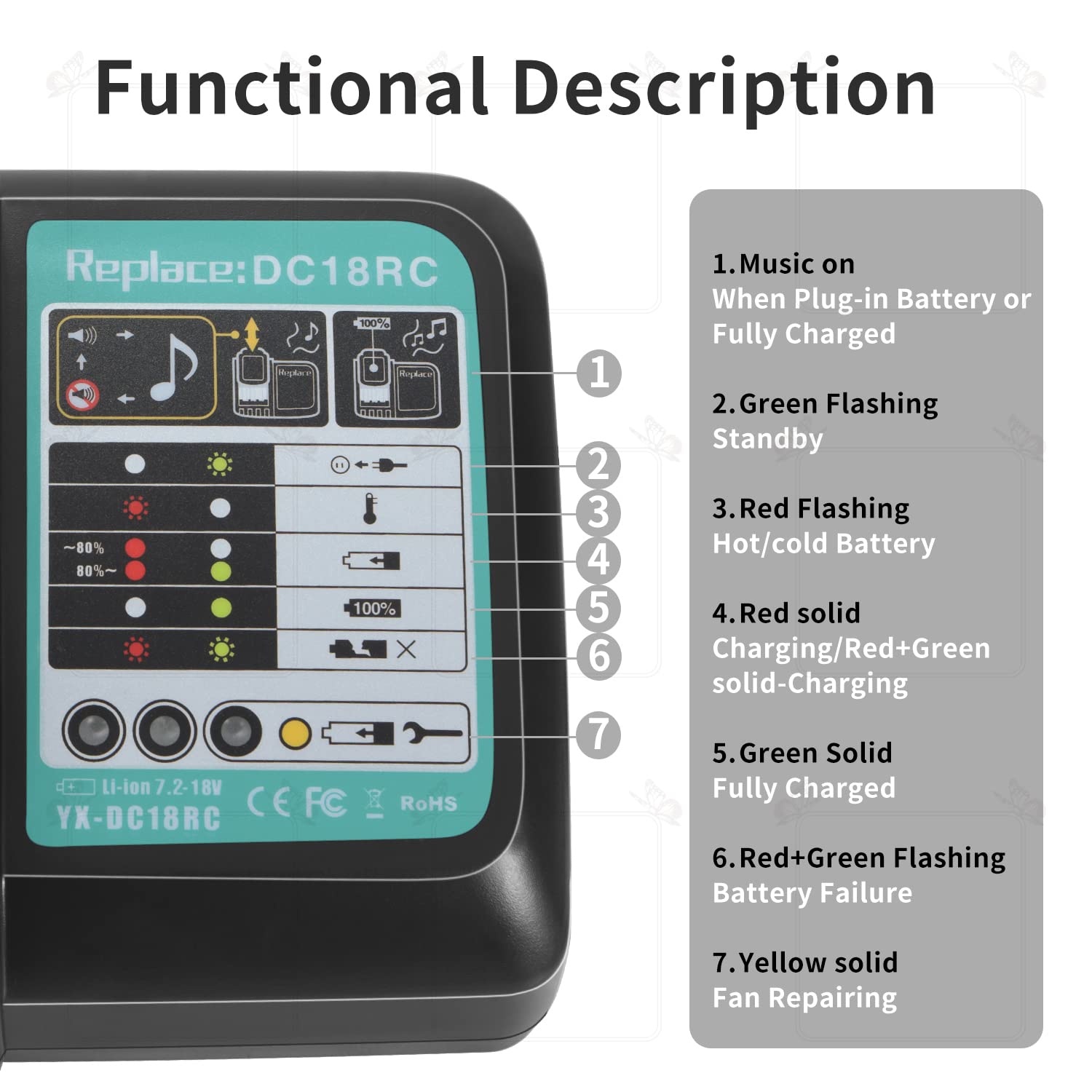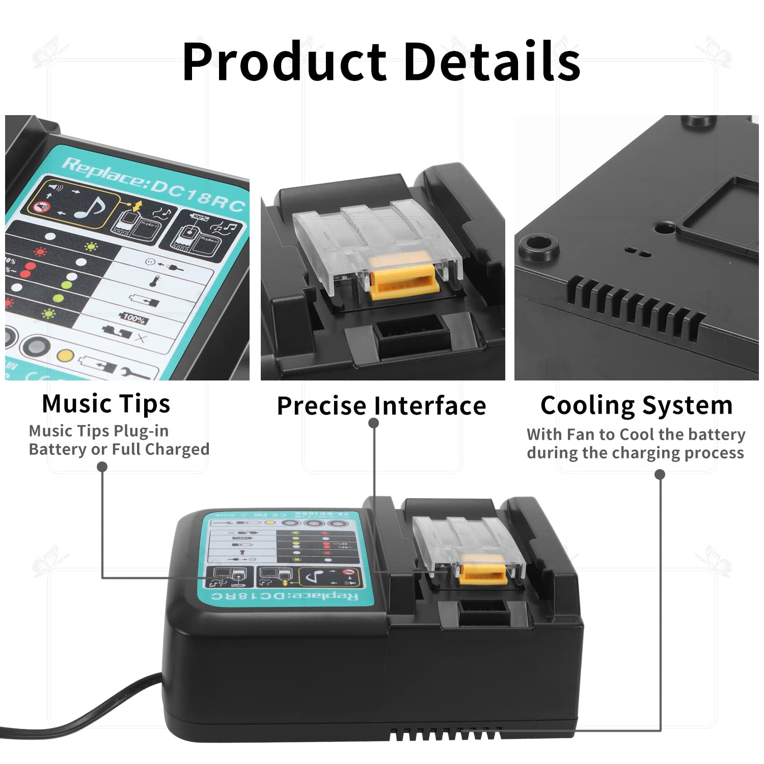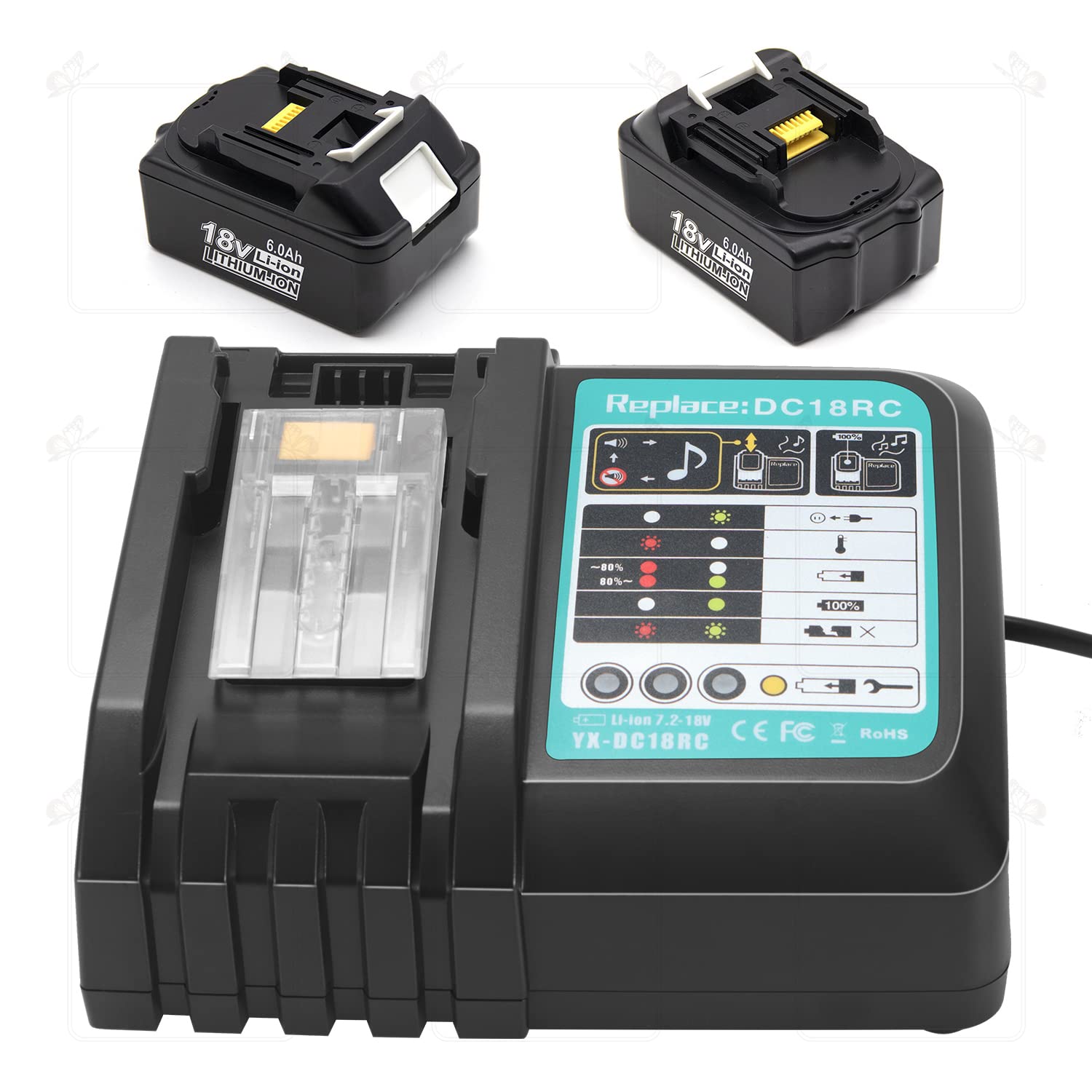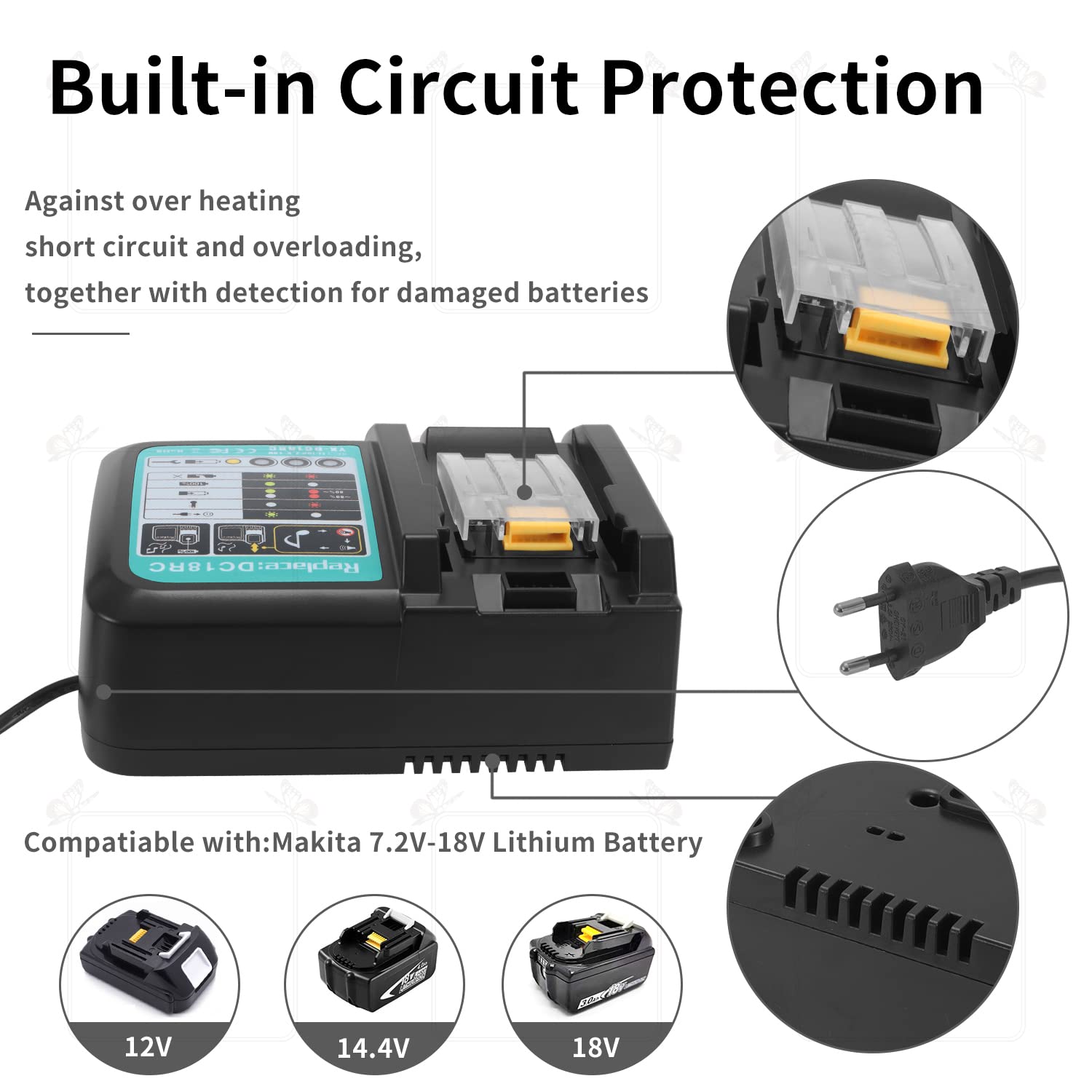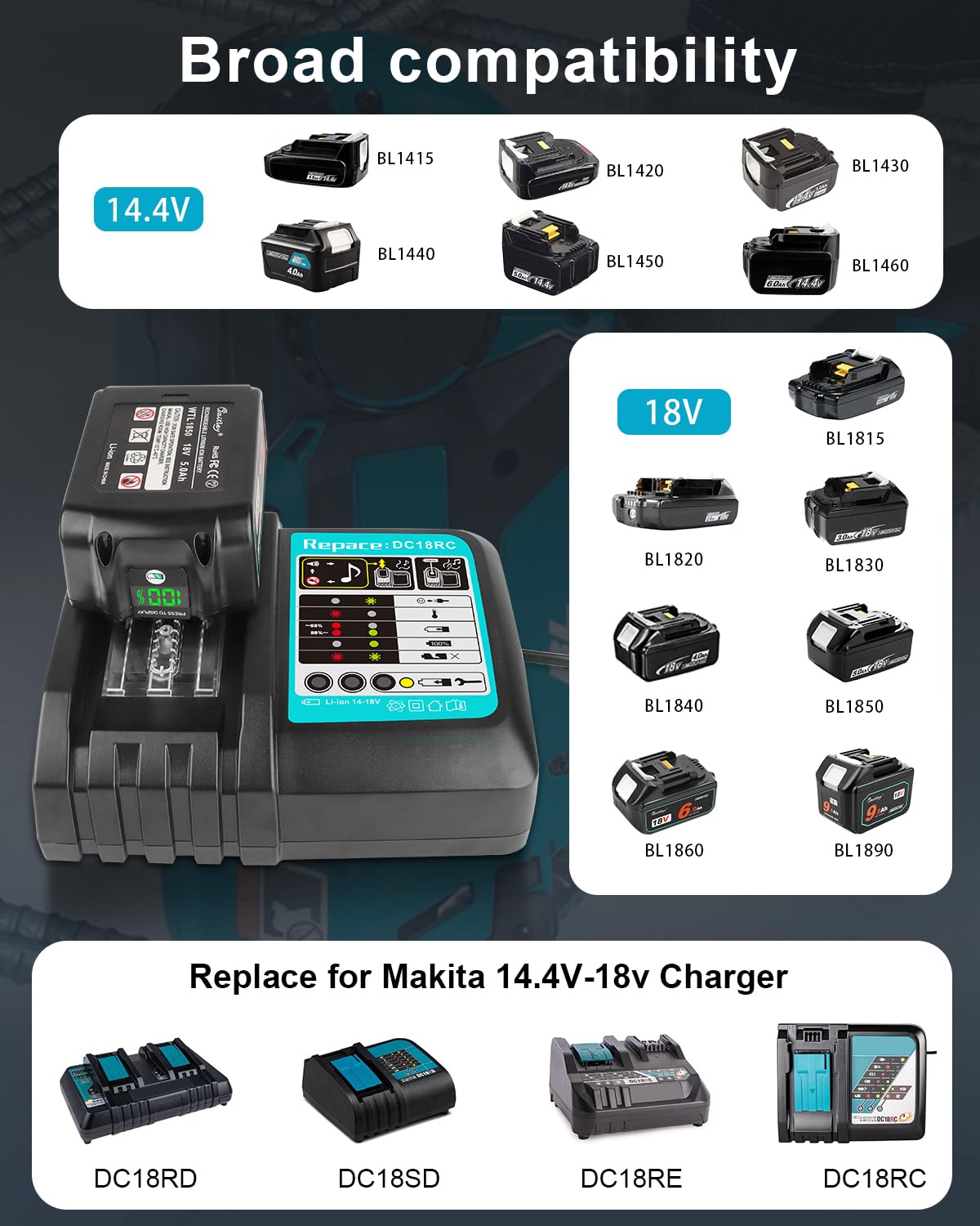 ✅️ سازگاری گسترده با باتری: مناسب برای باتریهای لیتیوم-یون Makita BL1815، BL1830، BL1840، BL1850، BL1860، BL1890، BL1415، BL1430، BL1440 و موارد دیگر 14.4 ولت تا 18 ولت.