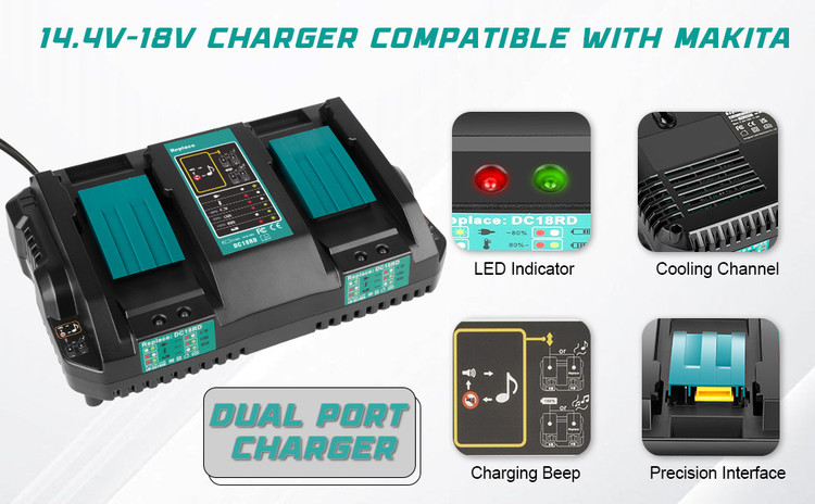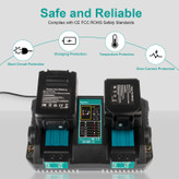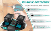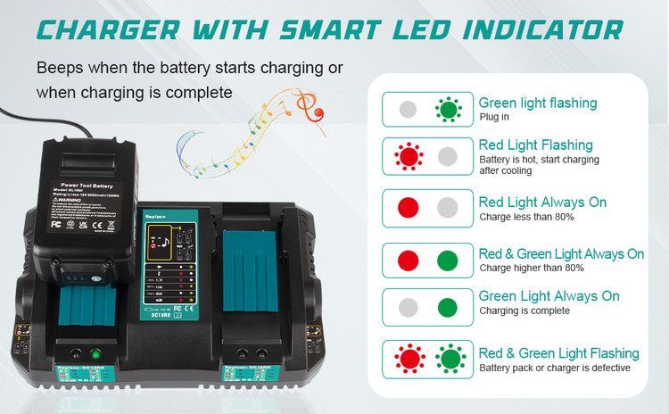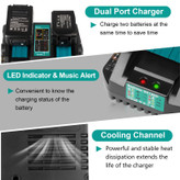 ✅️【شارژر باتری دو پورت】 شارژر باتری جایگزین برای Makita دارای دو پورت شارژ است که میتواند 2 باتری را در همزمان برای صرفهجویی در زمان شارژ؛ هر پورت شارژ دارای نشانگر LED و هشدار موسیقی است، هنگامی که به طور کامل شارژ میشود، موسیقی پخش میکند و یک چراغ سبز روشن میشود تا به شما یادآوری کند، میتوانید به راحتی از وضعیت شارژ و وضعیت باتری مطلع شوید.