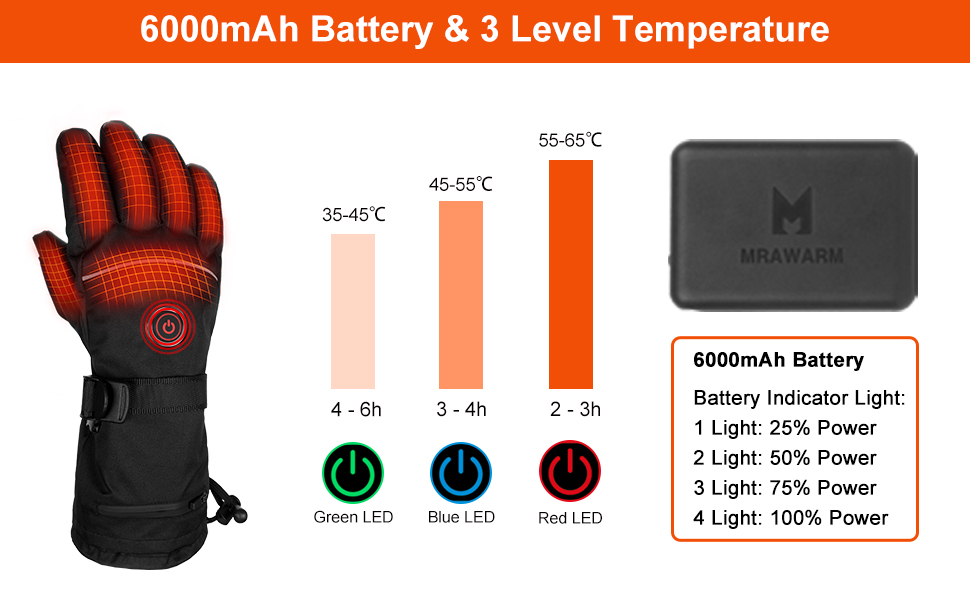 🔥【۳ سطح دما】 دستکشهای گرم شونده قابل شارژ MUTOUHE که با باتری لیتیوم-پلیمر ۶۰۰۰ میلیآمپر ساعتی کار میکنند، به شما کمک میکنند تا راحتترین دما را بین ۳۵ تا ۶۵ درجه سانتیگراد بسته به نیاز خود تنظیم کنید. این دستکش میتواند دستان شما را تا ۶ ساعت در هوای زمستانی گرم نگه دارد. همین حالا آن را مصرف کنید، فردا با دستان سرد خداحافظی کنید!