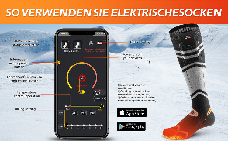 🔥 کنترل با اپلیکیشن گوشی هوشمند: جورابهای گرم شونده USB را میتوان از طریق اپلیکیشن گوشی هوشمند کنترل کرد. میتوانید دما را تنظیم کنید، تایمر تنظیم کنید، آن را روشن یا خاموش کنید یا هر جوراب را به صورت جداگانه تنها با یک ضربه کنترل کنید. دیگر نیازی به خم شدن نیست. این اپلیکیشن کاربرپسند است، از چندین زبان پشتیبانی میکند و نیازی به ثبت نام ندارد - به سادگی طبق دستورالعملها دانلود کنید. (فعالسازی بلوتوث لازم است)