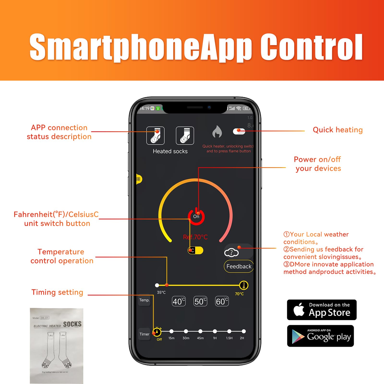 🔥 کنترل با اپلیکیشن گوشی هوشمند: جورابهای گرم شونده USB را میتوان از طریق اپلیکیشن گوشی هوشمند کنترل کرد. میتوانید دما را تنظیم کنید، تایمر تنظیم کنید، آن را روشن یا خاموش کنید یا هر جوراب را به صورت جداگانه تنها با یک ضربه کنترل کنید. دیگر نیازی به خم شدن نیست. این اپلیکیشن کاربرپسند است، از چندین زبان پشتیبانی میکند و نیازی به ثبت نام ندارد - به سادگی طبق دستورالعملها دانلود کنید. (فعالسازی بلوتوث لازم است)