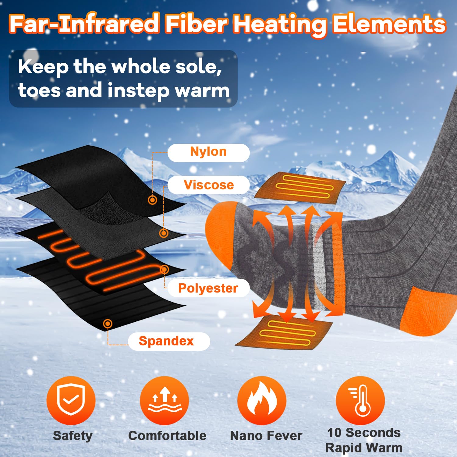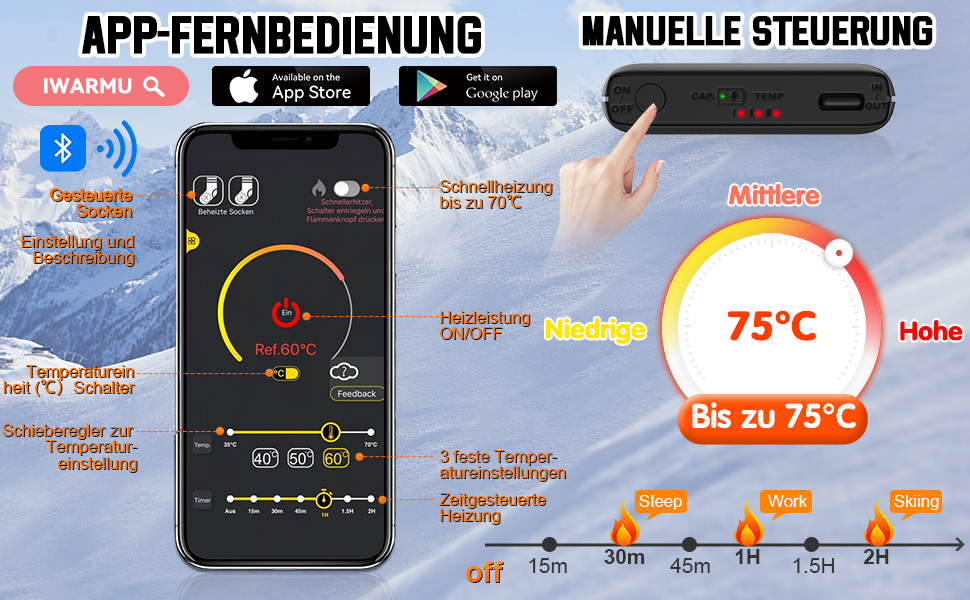 🔥 تنظیم دقیق دما و 6 تنظیم کنترل زمان: دمای جورابهای گرم شونده باتریدار را میتوان از طریق اپلیکیشن به طور دقیق در هر دمایی بین 95 تا 158 درجه فارنهایت تنظیم کرد. با قابلیت تایمر که در 6 بخش زمانی (15 دقیقه، 30 دقیقه، 45 دقیقه، 60 دقیقه، 90 دقیقه، 120 دقیقه) کار میکند. این جورابهای گرم مردانه میتوانند پس از زمان دلخواه شما به طور خودکار خاموش شوند.