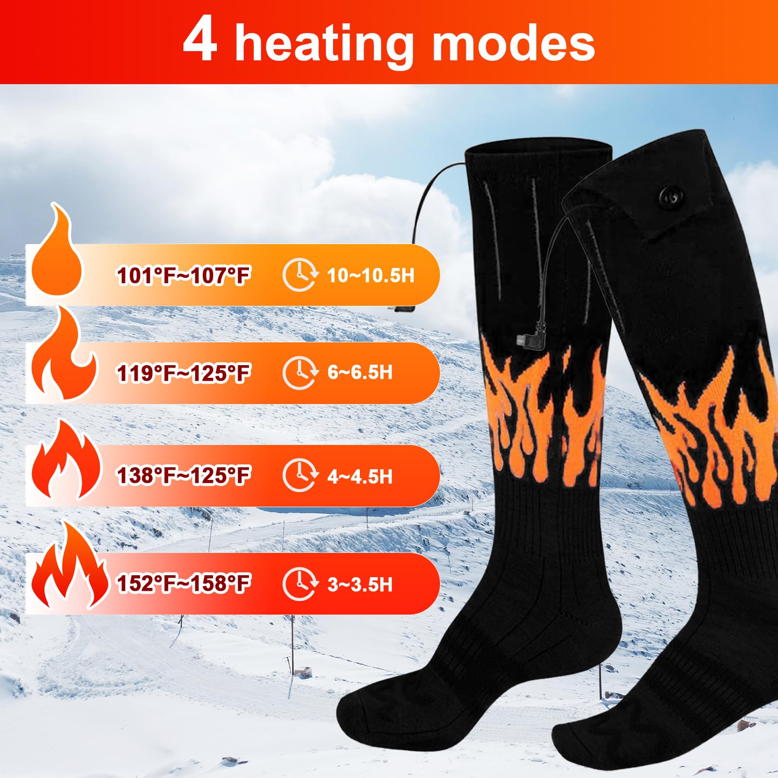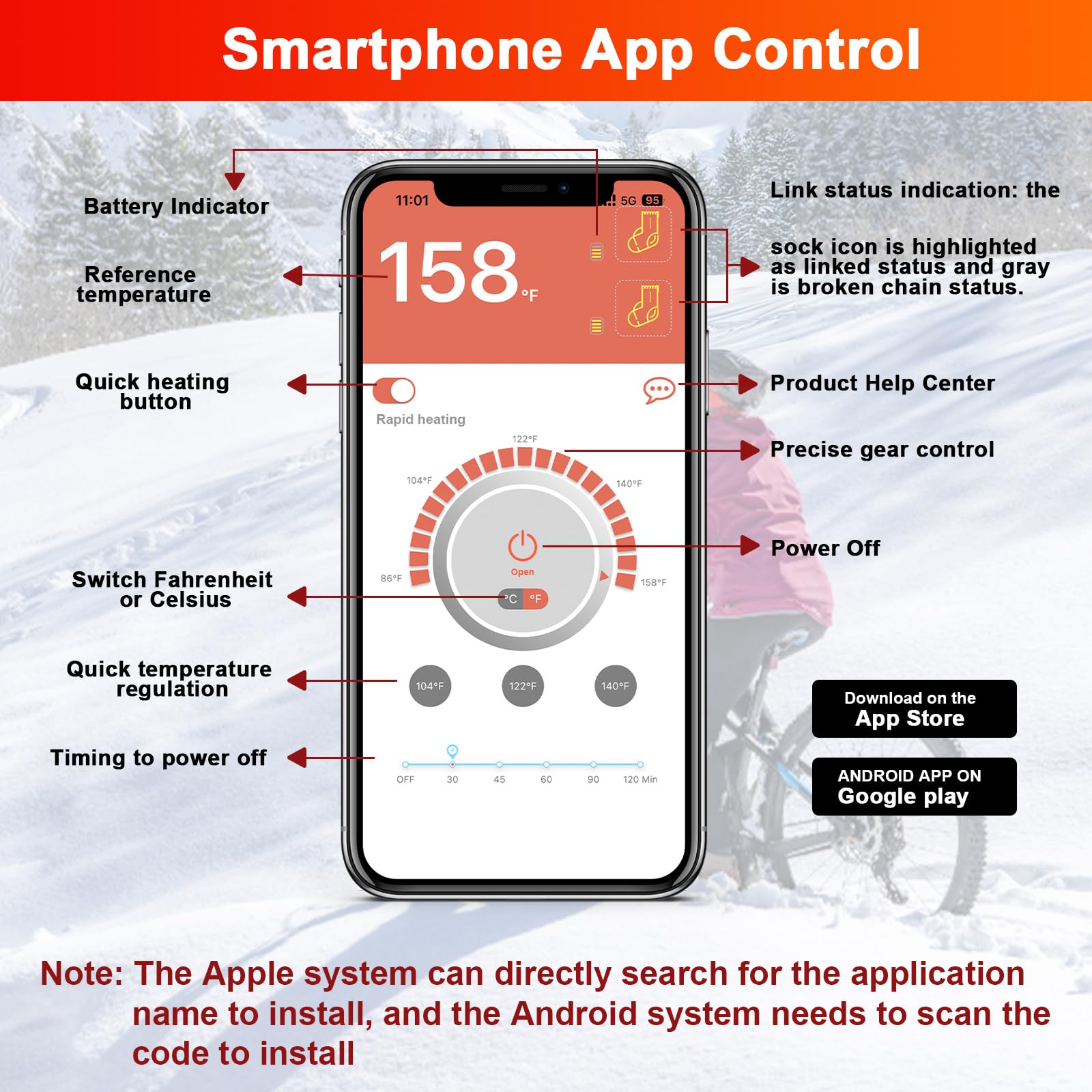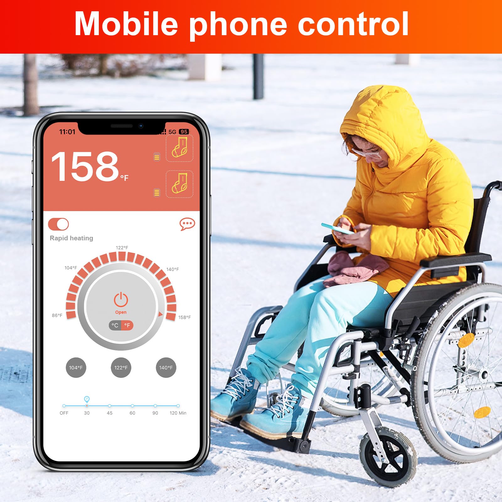 🔥 کنترل از طریق اپلیکیشن: جورابهای گرم شونده قابل شارژ را میتوان با اپلیکیشن "WARM UPING" کنترل کرد، در هر زمان، ۴ دمای جوراب گرم شونده بین ۱۰۴ تا ۱۴۹ درجه فارنهایت تنظیم میشود تا انگشتان پا راحت باشند. عملکرد زمان جدید، شامل پنج دوره زمانی ثابت، به افزایش زمان استفاده از باتری کمک میکند.