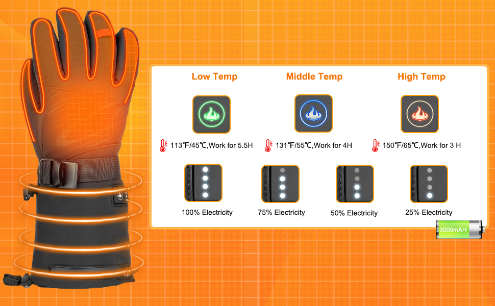 🔥 قابل شارژ و عملکرد ۳ سرعته: دو باتری قابل شارژ ۷.۴ ولت ۳۰۰۰ میلیآمپر ساعتی میتوانند با یک بار شارژ کامل به مدت ۳ تا ۶ ساعت کار کنند. این دستکشهای گرمشونده دارای سه تنظیم دما هستند: بالا (150 درجه فارنهایت / 65.5 درجه سانتیگراد)، متوسط (131 درجه فارنهایت / 55 درجه سانتیگراد) و پایین (113 درجه فارنهایت / 45 درجه سانتیگراد)، که به شما امکان میدهد دما را به راحتی با توجه به نیازهای خود تنظیم کنید و راحتی را در شرایط سرد زمستان تضمین کنید.